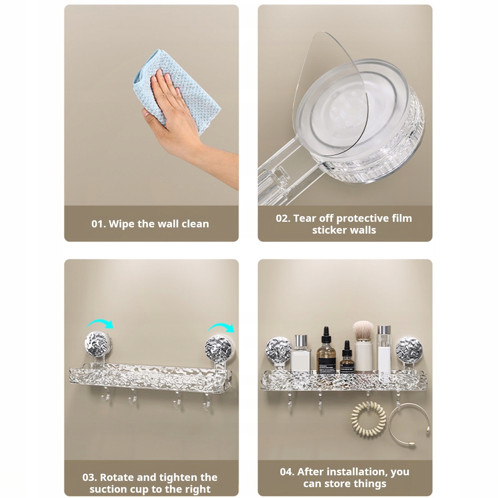 Простая установка. Попрощайтесь с хлопотами по сверлению отверстий с помощью этой инновационной полки для хранения в ванной. Конструкция присоски обеспечивает установку без повреждений, поэтому ее можно легко установить без инструментов.