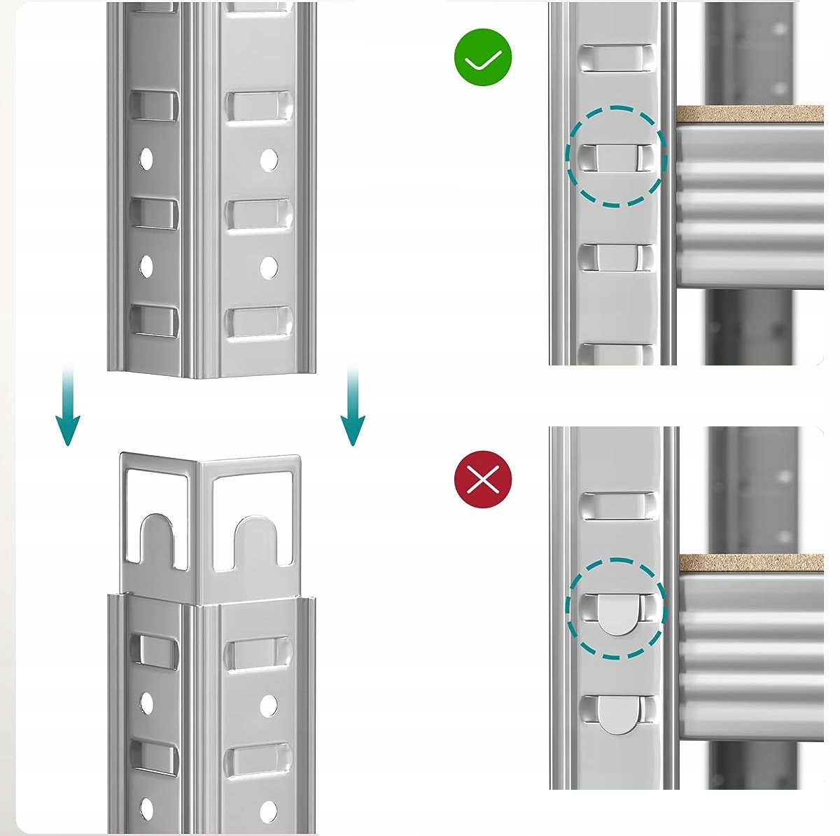 Чтобы правильно собрать полку, сначала соберите 2 отдельные полки, а затем соедините их вместе. Также важно правильно отрегулировать защелки, как показано на фотографиях ниже. Для сборки полки используйте резиновый молоток или подкладку в виде доски под обычный молоток.