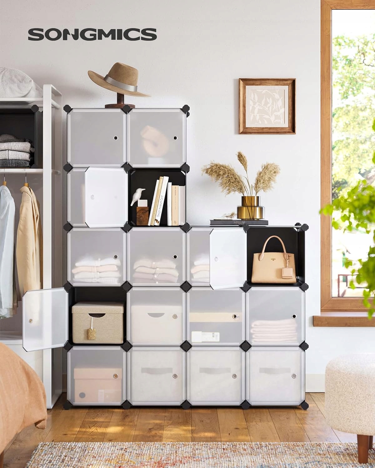Стеллажная система SONGMICS, 16 кубов, шкаф для одежды пластиковый, с дверцами, полка для обуви, для хранения одежды, обуви, игрушек и книг, вставная полка, легкая сборка, черный