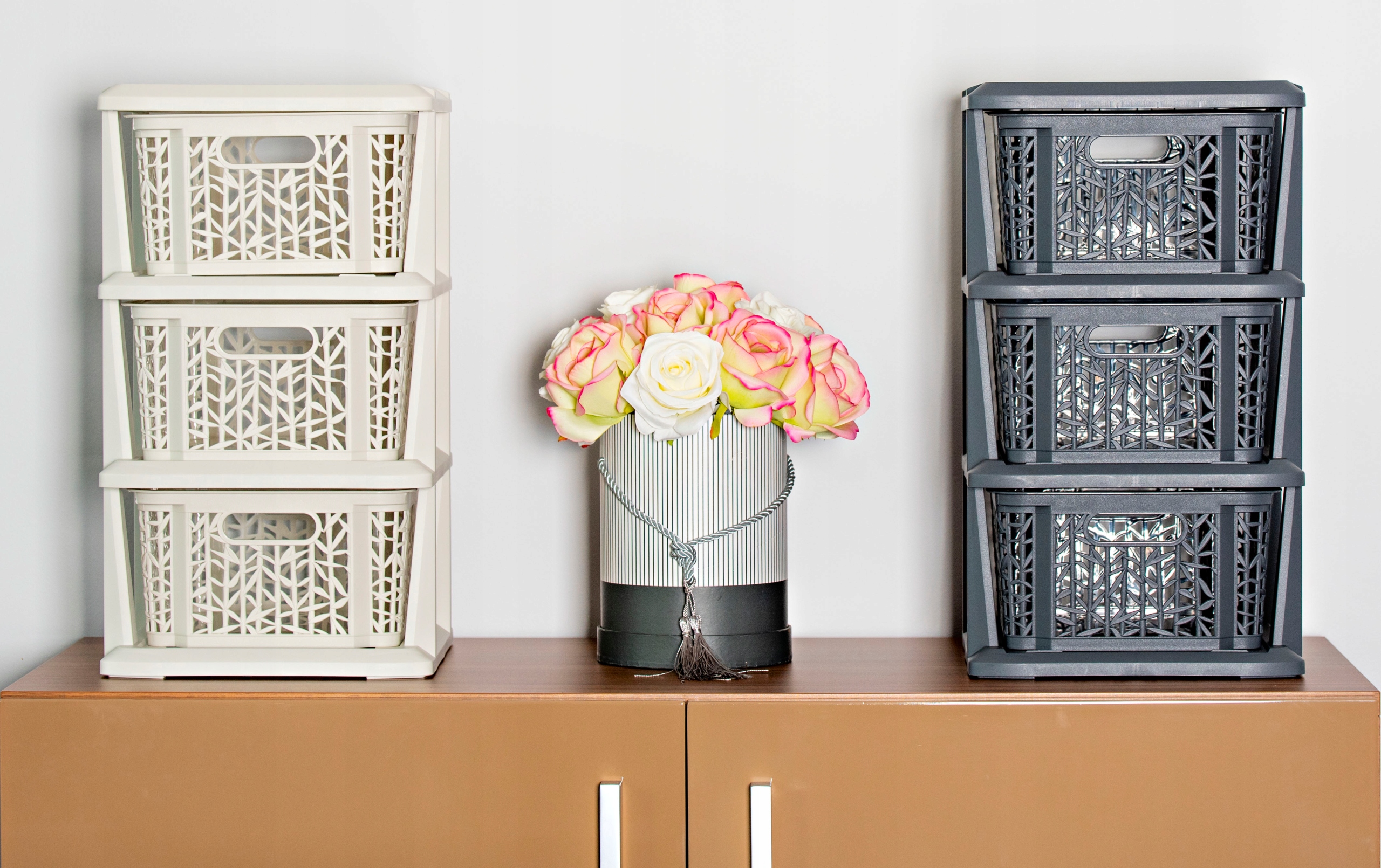 Изделие состоит из 3-х контейнеров, выполняющих функцию ящиков. Они выполнены из пластика, но внешне напоминают ажурные корзинки. > b> Благодаря этому они выглядят очень эстетично.