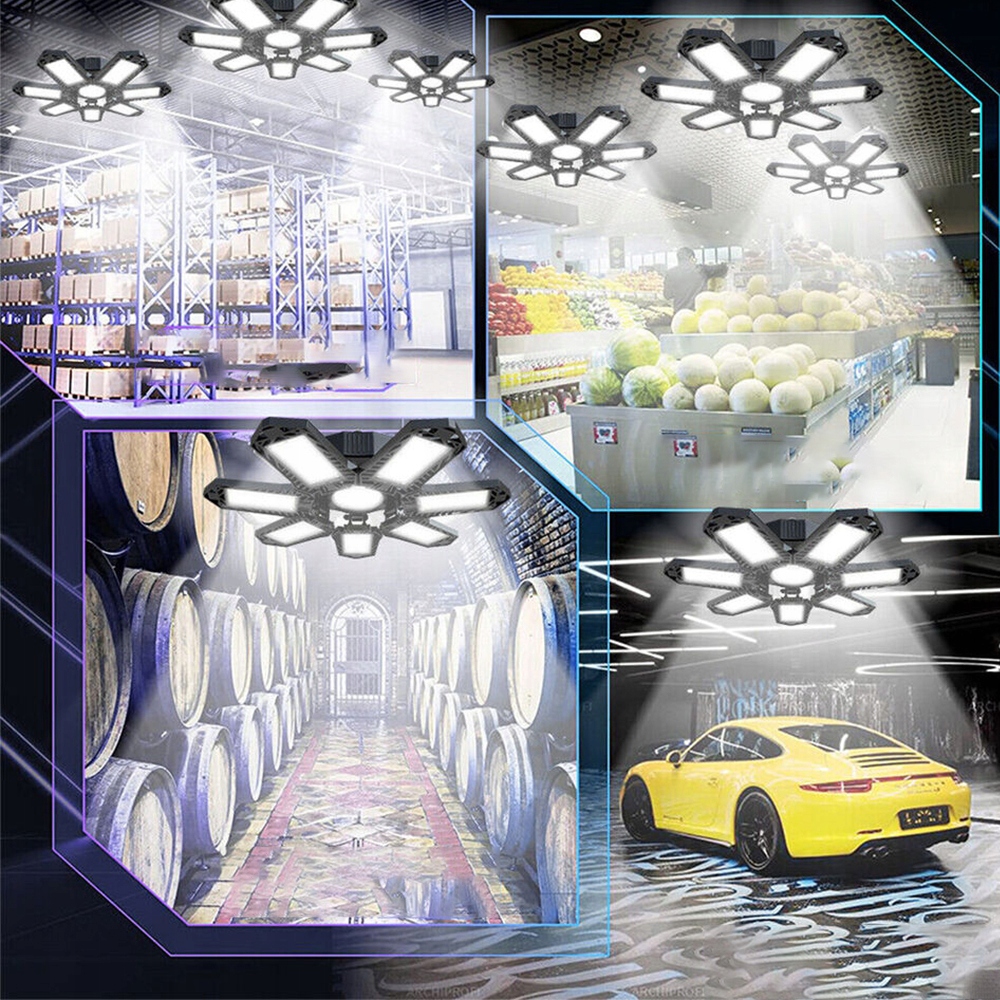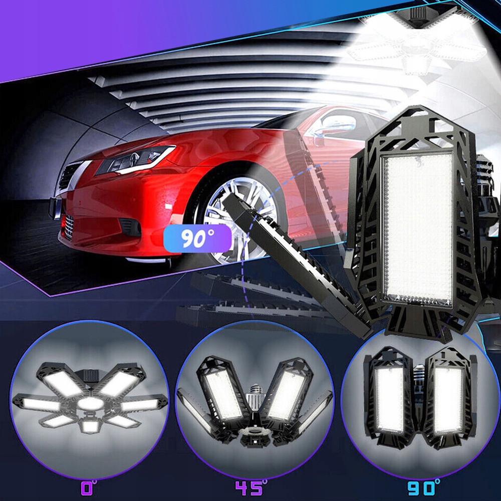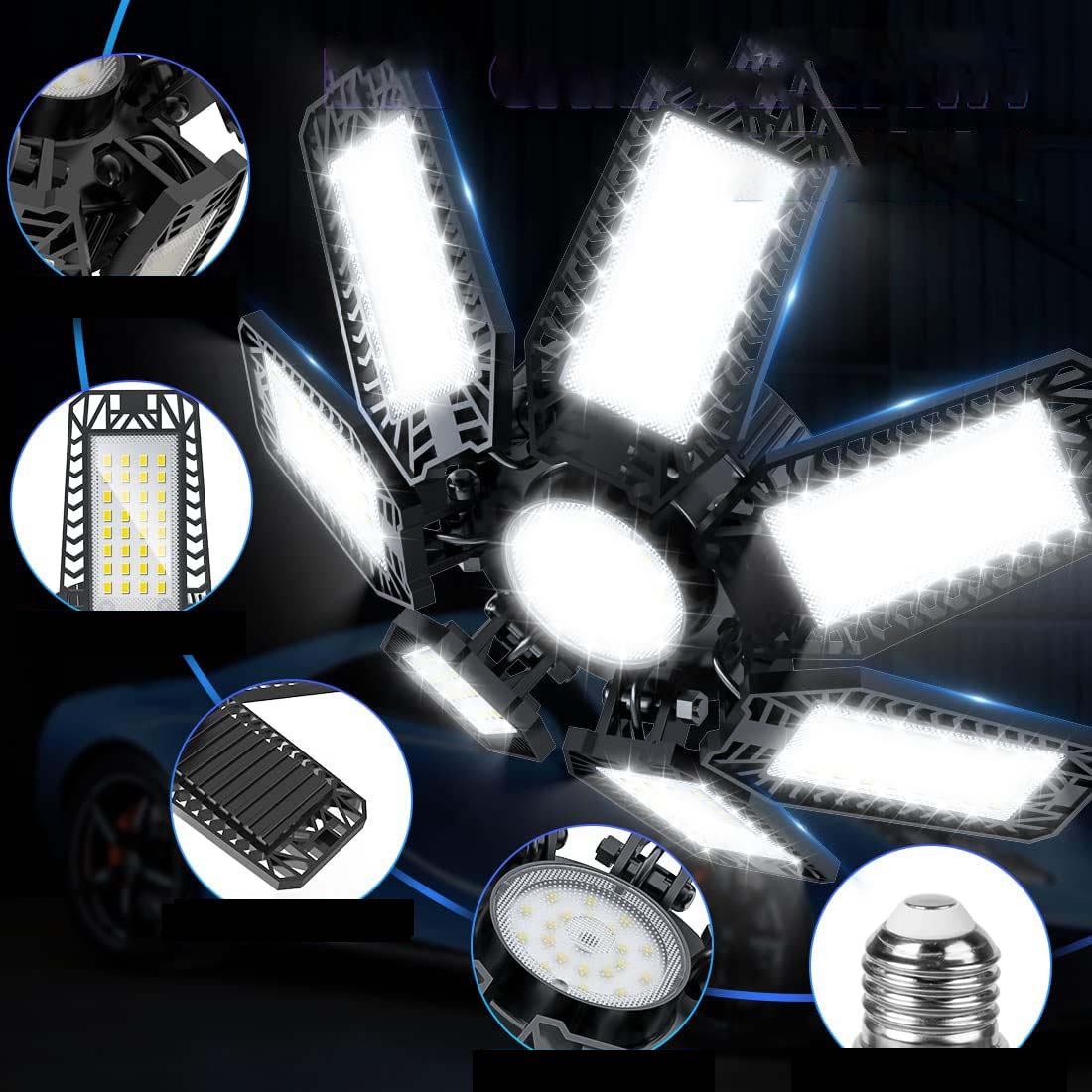 🌟 【Светодиодный гаражный дизайн освещения с 7 панелями】 Гаражного освещения с использованием чипсов, защищающих глаза в гараже, состоящий из 7 супер ярких, регулируемых светодиодных панелей и 1 центральной поверхности, излучающей свет. Вы можете отрегулировать в диапазоне от 0 до 90 градусов, чтобы получить полное освещение на 360 °. И легко освещать различные темные углы, вам больше не нужен фонарик, чтобы найти вещи.