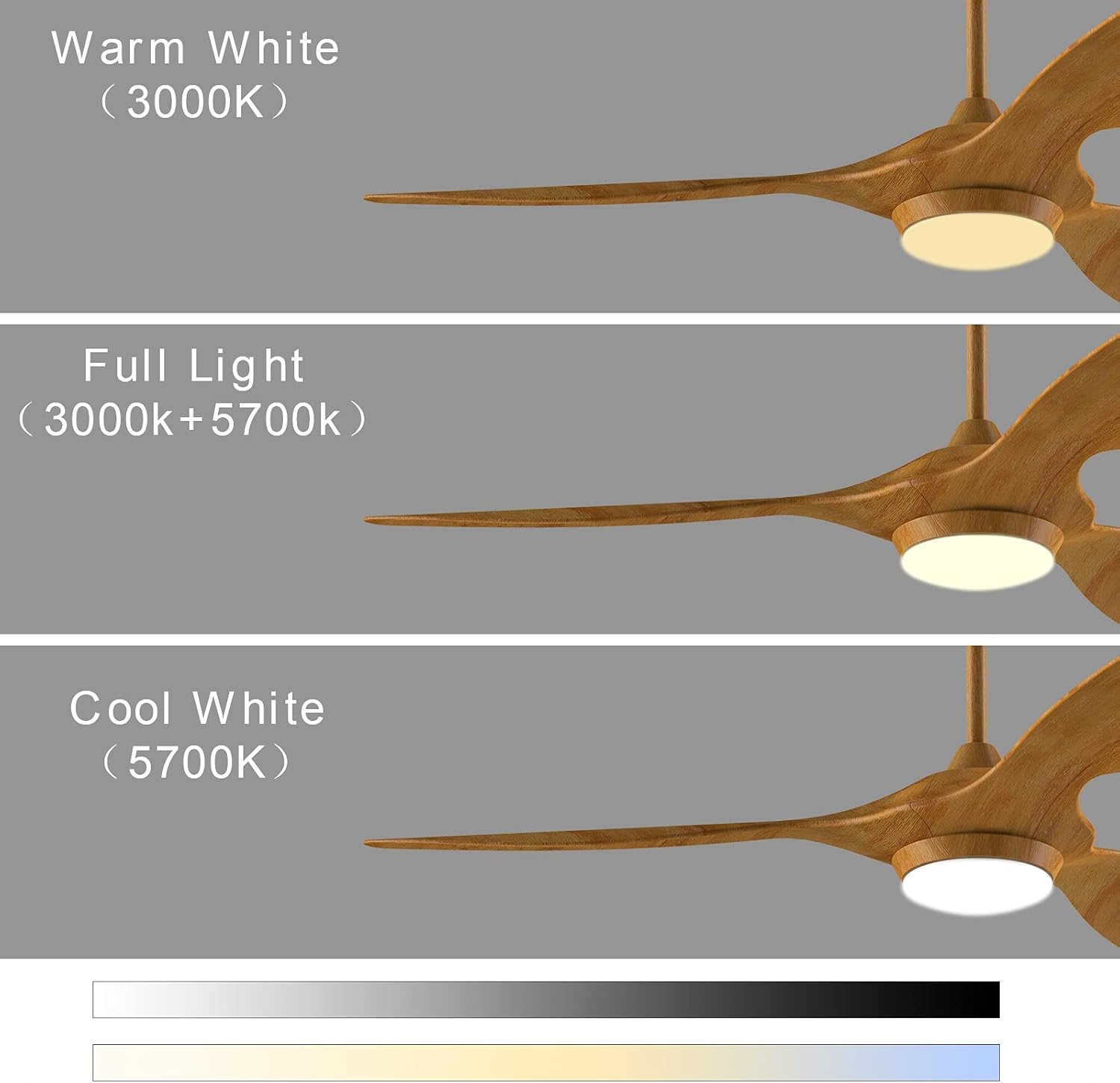 Адаптация света: светодиодный свет потолочного вентилятора может быть отрегулирован в 3 цвета (теплый свет 3000K, естественный свет 4000K, белый свет 5700K). Регулирование частоты яркости в диапазоне 0-100%.