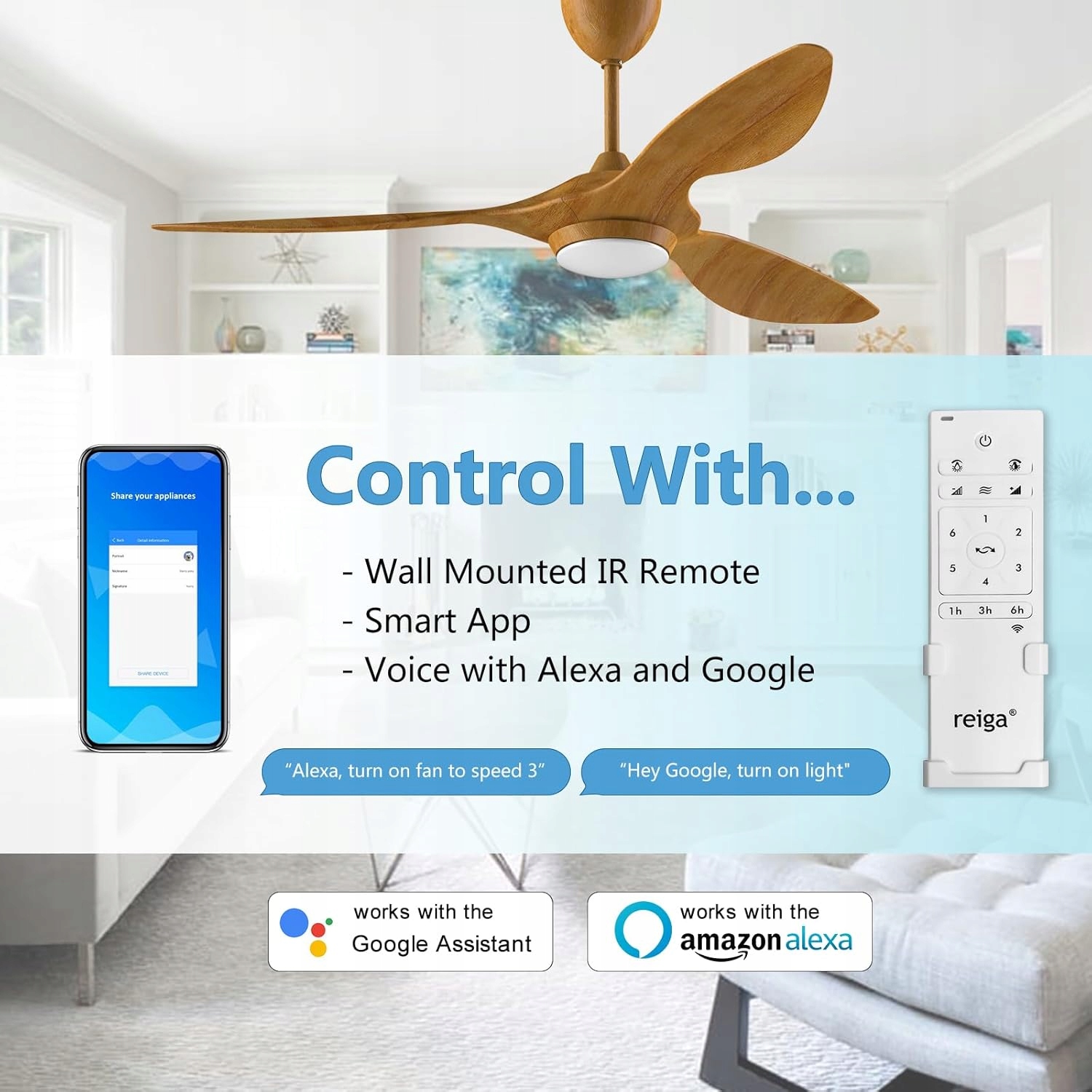 Интеллектуальный потолочный вентилятор с дистанционным управлением: Morden. Потолочный вентилятор предлагает 3 параметра управления: пульт дистанционного управления, голос или применение. Вы можете управлять всеми функциями без усилий с помощью простых голосовых команд через Alexa или телефон