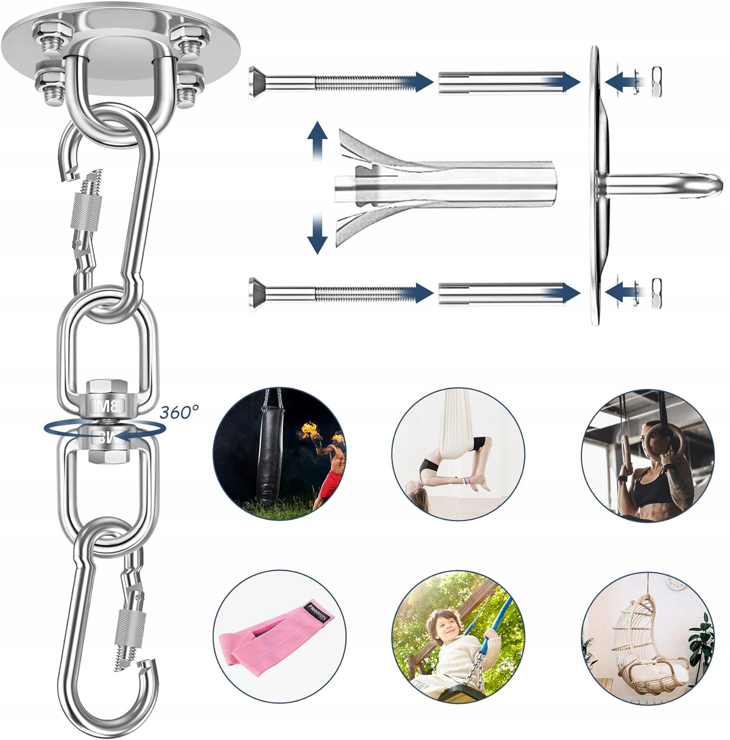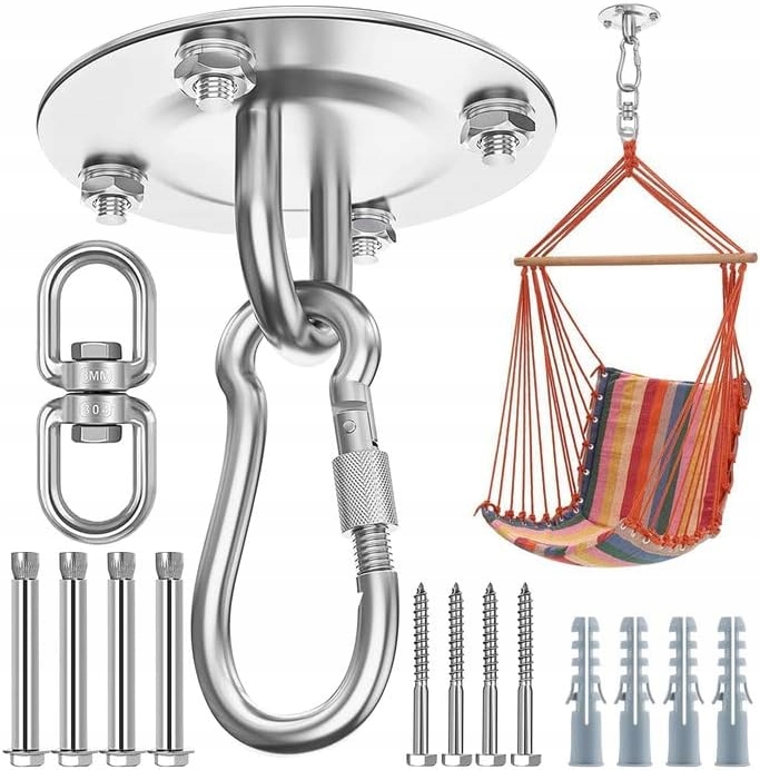 ► Прочные крючки для качелей: содержат 4x расширения винтов, 4x винты, 4 -х шестиугольные винты, 1x нержавеющая стальная штука, 1x кольцо герта, 1x целостные. Потолочный крючок на 360 ° к набору качелей может выдержать нагрузку до 450 кг, что делает его идеальным для повесения стула гамака, качания, тренировочной сумки и йоги йоги для расслабления внутри и снаружи. Его также можно использовать, чтобы повесить тяжелые предметы в гараже.