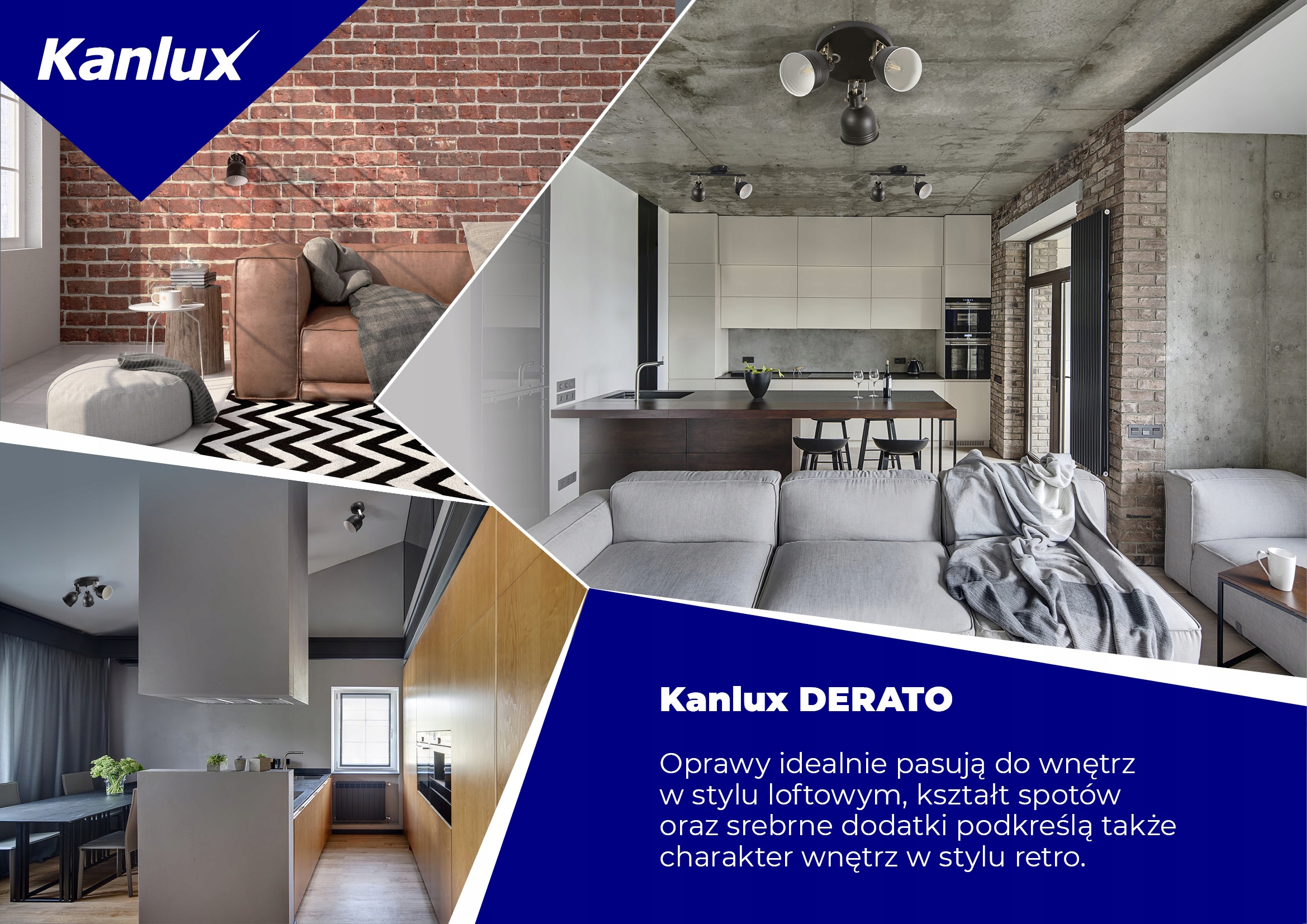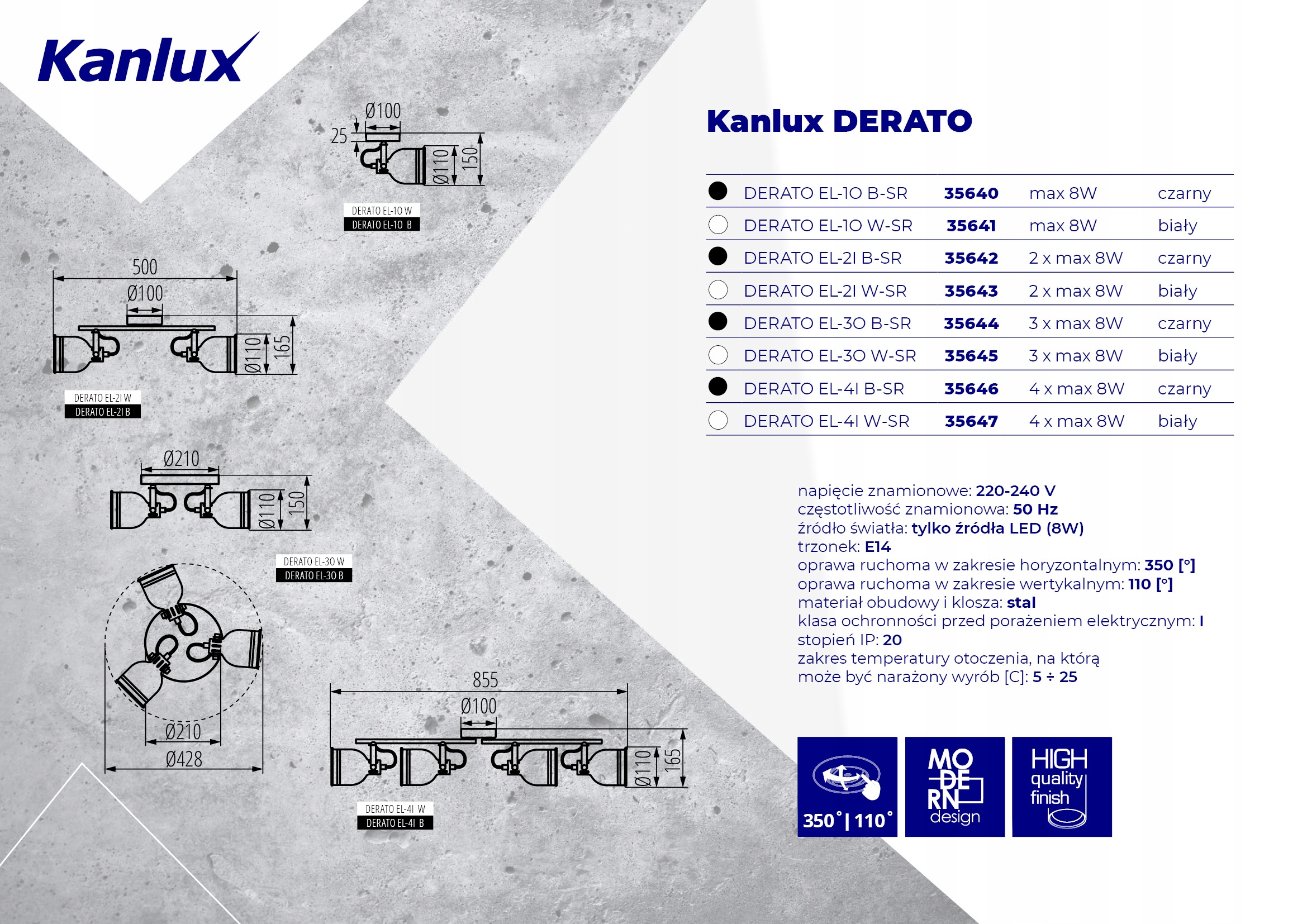 Новая серия Форма светильников Kanlux DERATO отсылает к стилю РЕТРО. Это лампы двух цветов: белого и черного, имеющие от 1 до 4 световых точек. Одноточечный Kanlux DERATO также успешно послужит бра. Большие абажуры этих светильников также предоставляют большие возможности для использования различных источников света с цоколем Е14 (макс. 8 Вт). Светильники Kanlux DERATO оснащены быстроразъемным разъемом для удобного и быстрого монтажа. Дополнительным преимуществом является очень широкая возможность направления абажура в любое место (две оси вращения: 350 и 150 градусов).