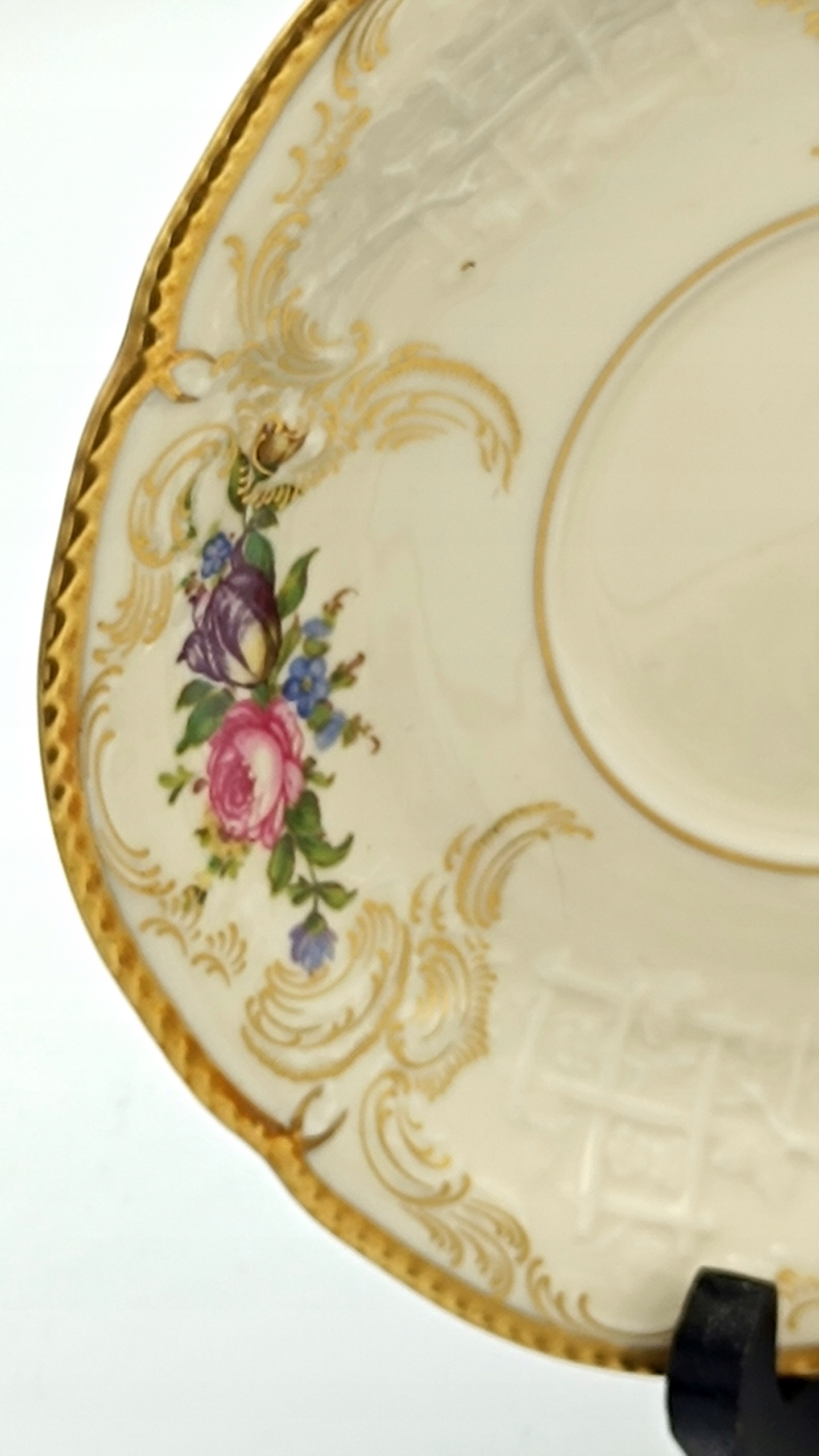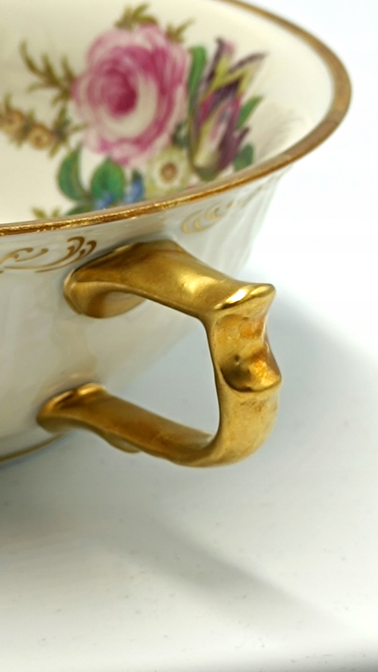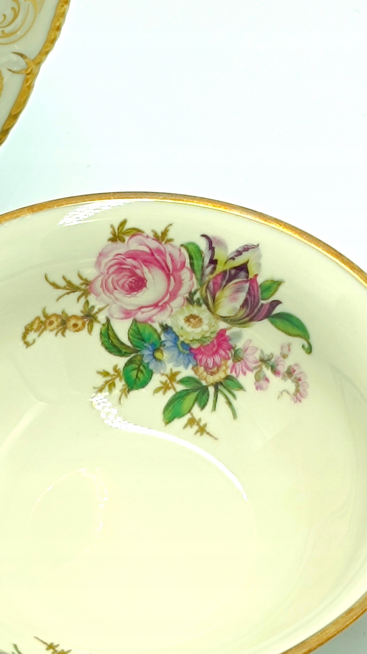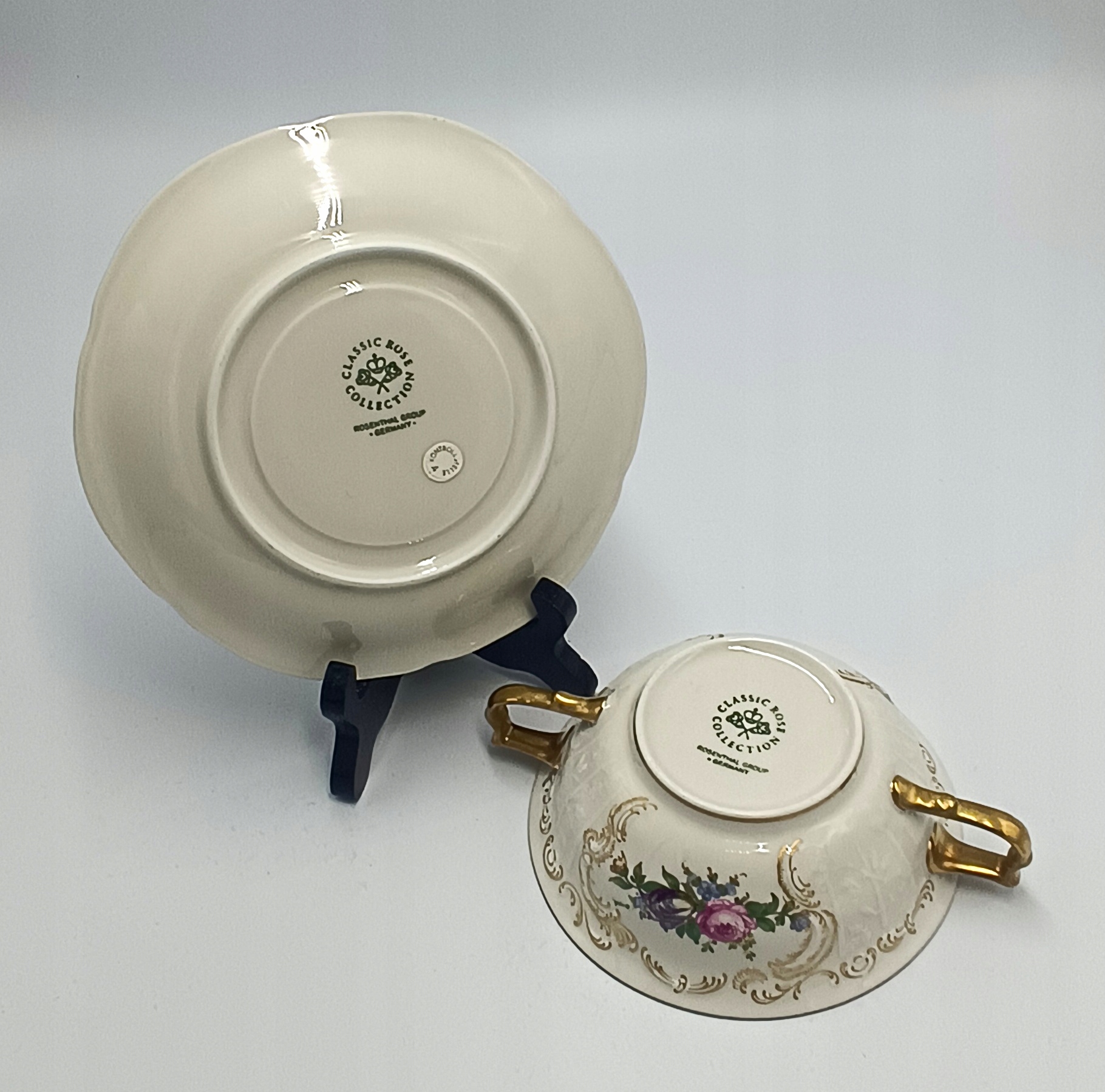 Бульонница и блюдце изготовлены из фарфора цвета экрю высочайшего качества, украшены красочным цветочным мотивом, позолоченными узорами, густо позолоченными ручками и характерным для серии Сан-Суси рельефом. Само слово означает БЕЗБЕЗОПАСНЫЙ. Коллекция Сан-Суси была разработана Карлом Байройтером в 1894 году. Форма с выдавленным орнаментом из виноградной лозы, вдохновленная стилем рококо и интерьерами дворца Сан-Суси в Потсдаме. Этот конкретный узор можно найти в одной из комнат. Sanssouci DIPLOMAT – одна из самых эксклюзивных коллекций этого бренда. Он сочетает в себе не только элегантность, но также роскошь и престиж. Этот фарфор расписан вручную квалифицированными художниками. Фарфор Rosenthal – это синоним роскоши, высококачественных материалов, элегантности и красоты. На банке с слитками и блюдце есть подписи внизу.