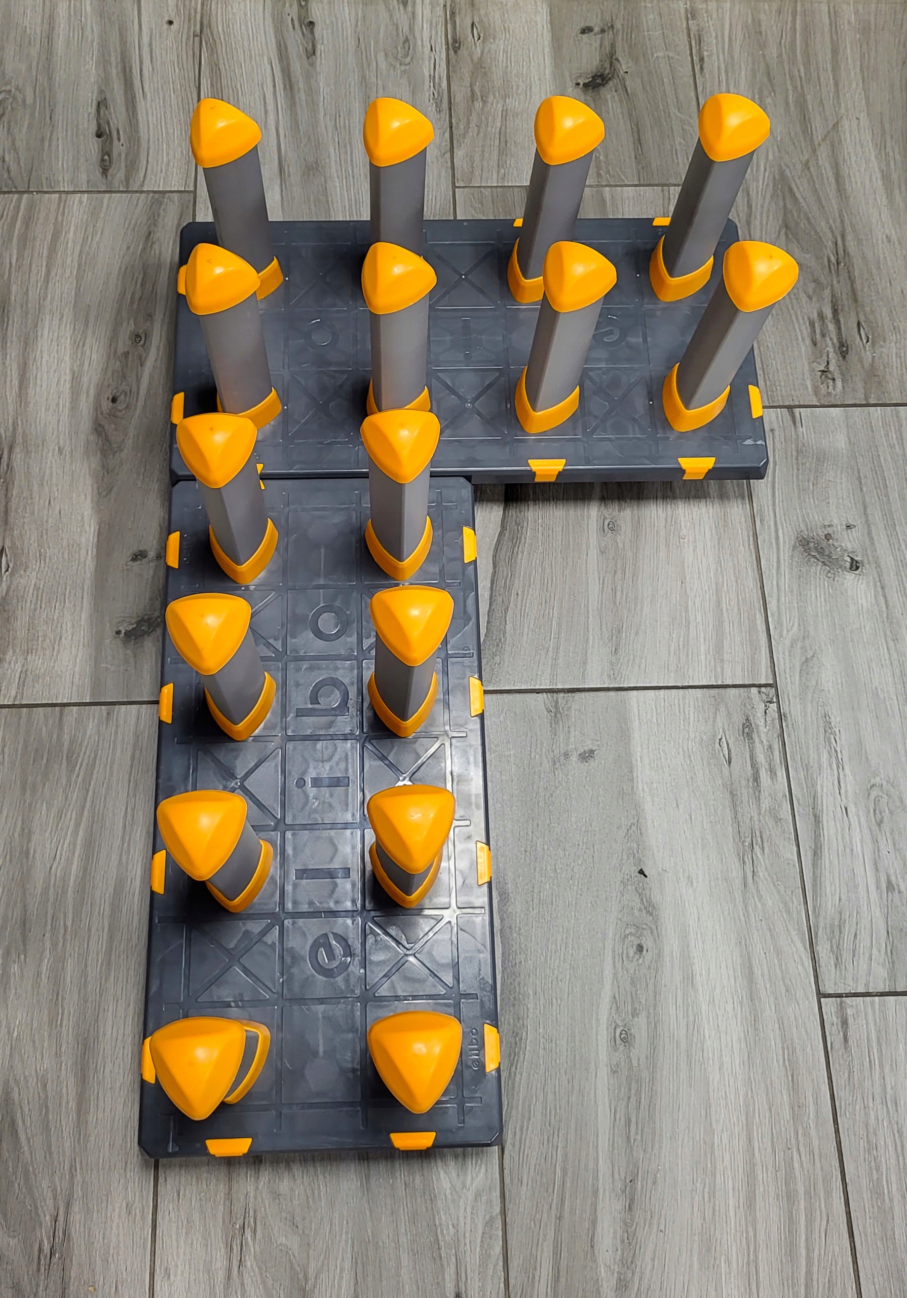 Медиа-стенд, состоящий из двух модулей, каждый по 8 мест для рулонов (всего 16). Подставка помогает организовать пространство и защищает носитель от опрокидывания.