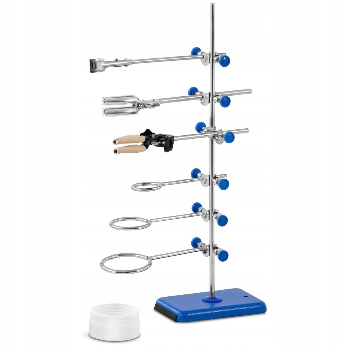 Стенд лабораторный состоит из устойчивой чугунной основы размером 210 х 130 мм, стержня из хромированной стали, шести поперечных зажимов из алюминия с покрытием, двух нержавеющих стальные зажимы, зажим для бюретки и три железных кольца размерами 60/80/100 мм. Пластиковая подставка завершает комплект.