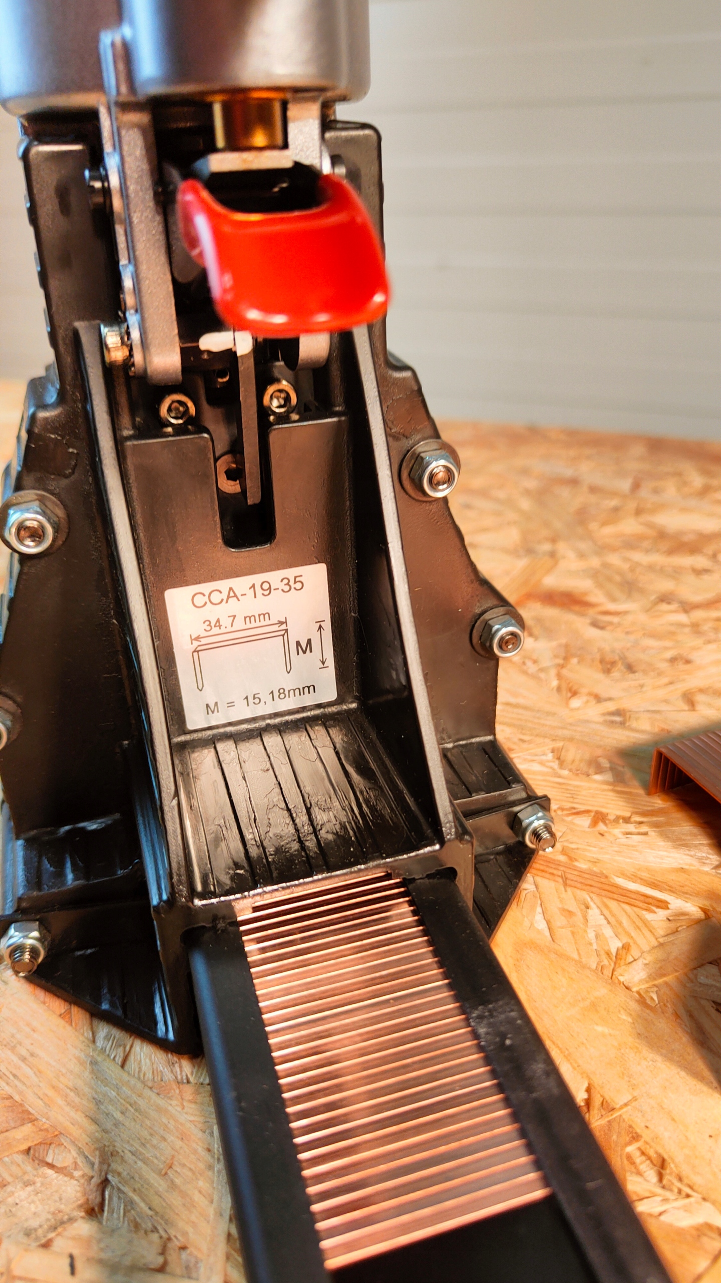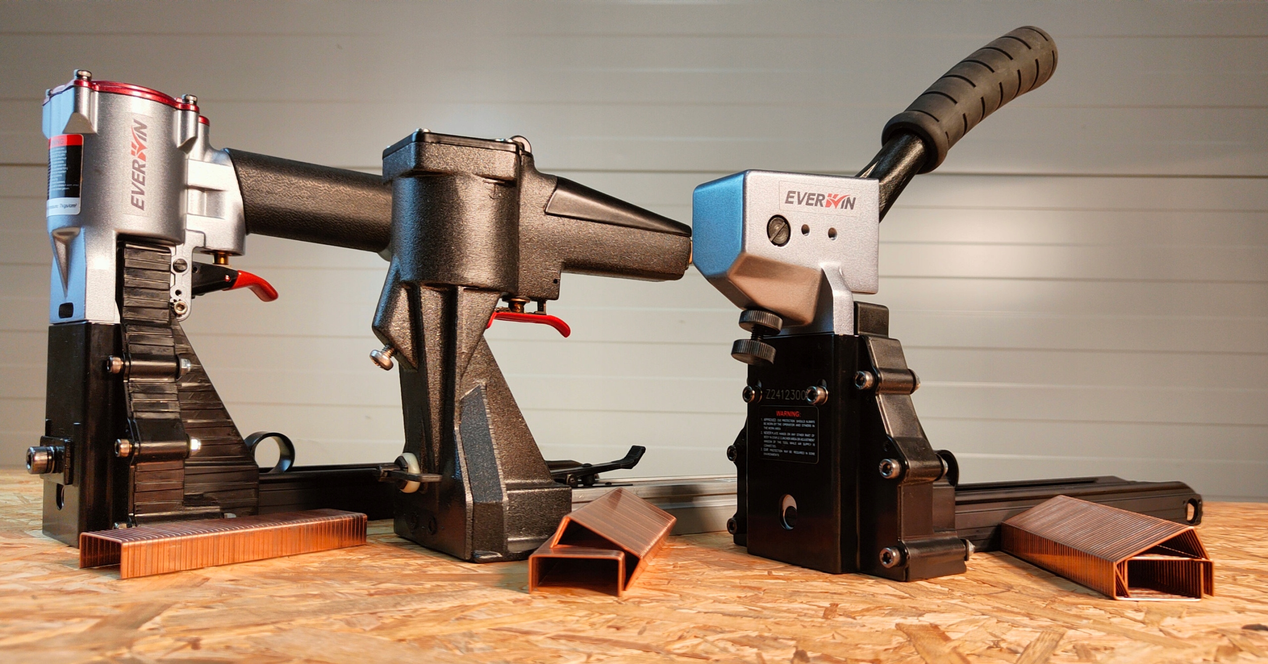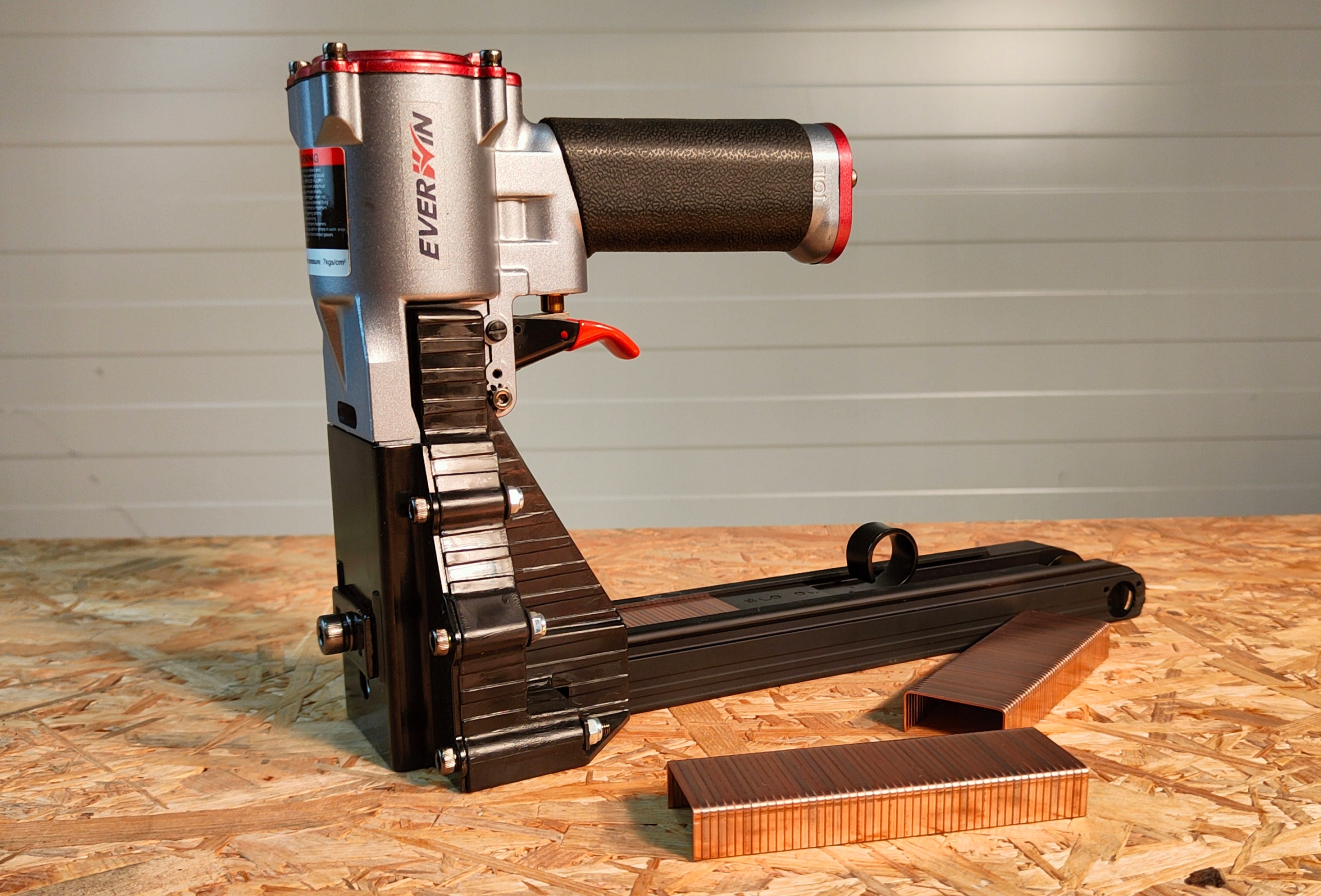 Ближе — пневматический степлер для картонных коробок Everwin CCA19-35 со скобами типа 35 длиной 15–18 мм