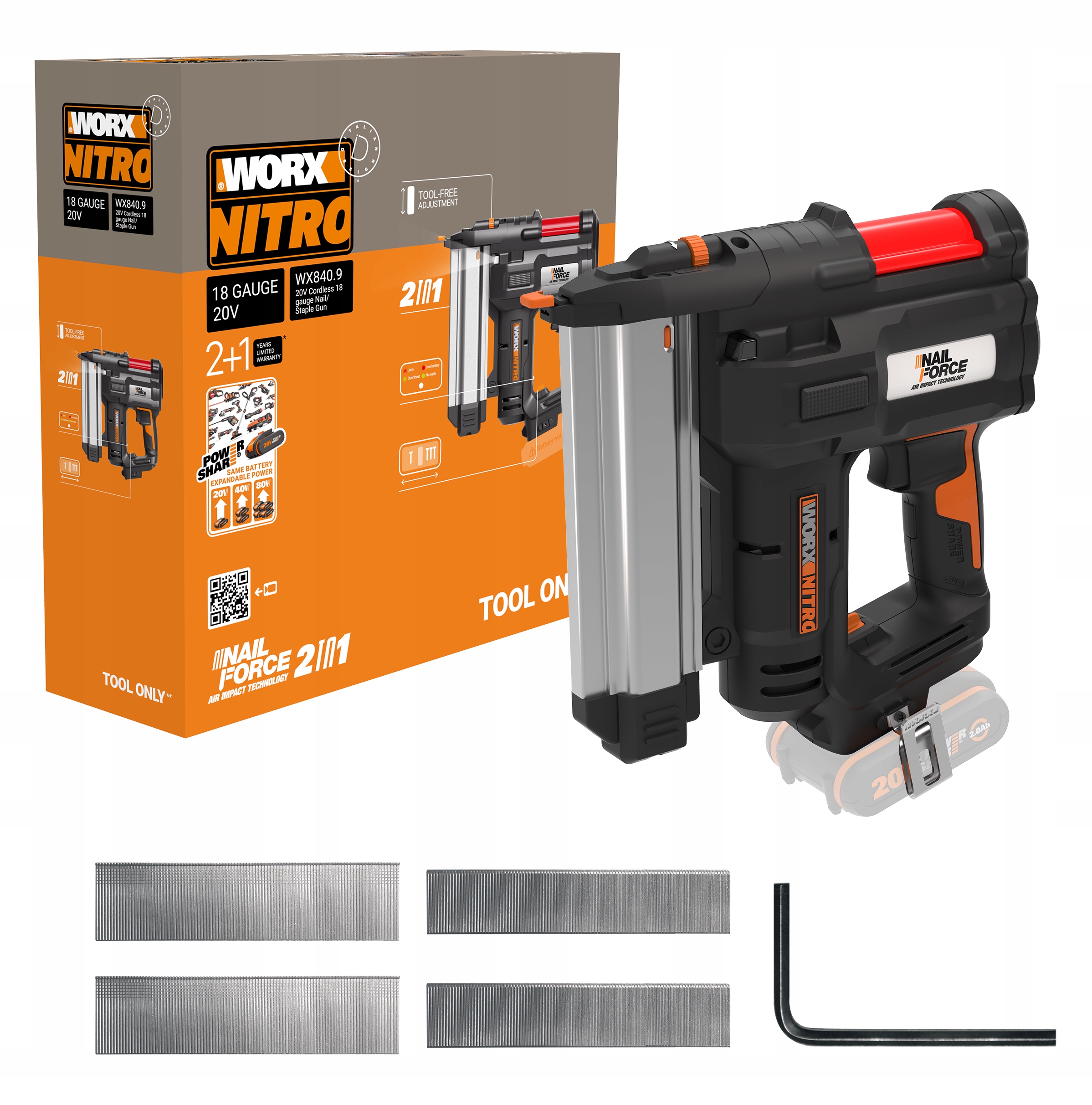 Два инструмента в одном - гвоздезабиватель и степлер, оснащенный бесщеточным двигателем, работающим от аккумулятора.