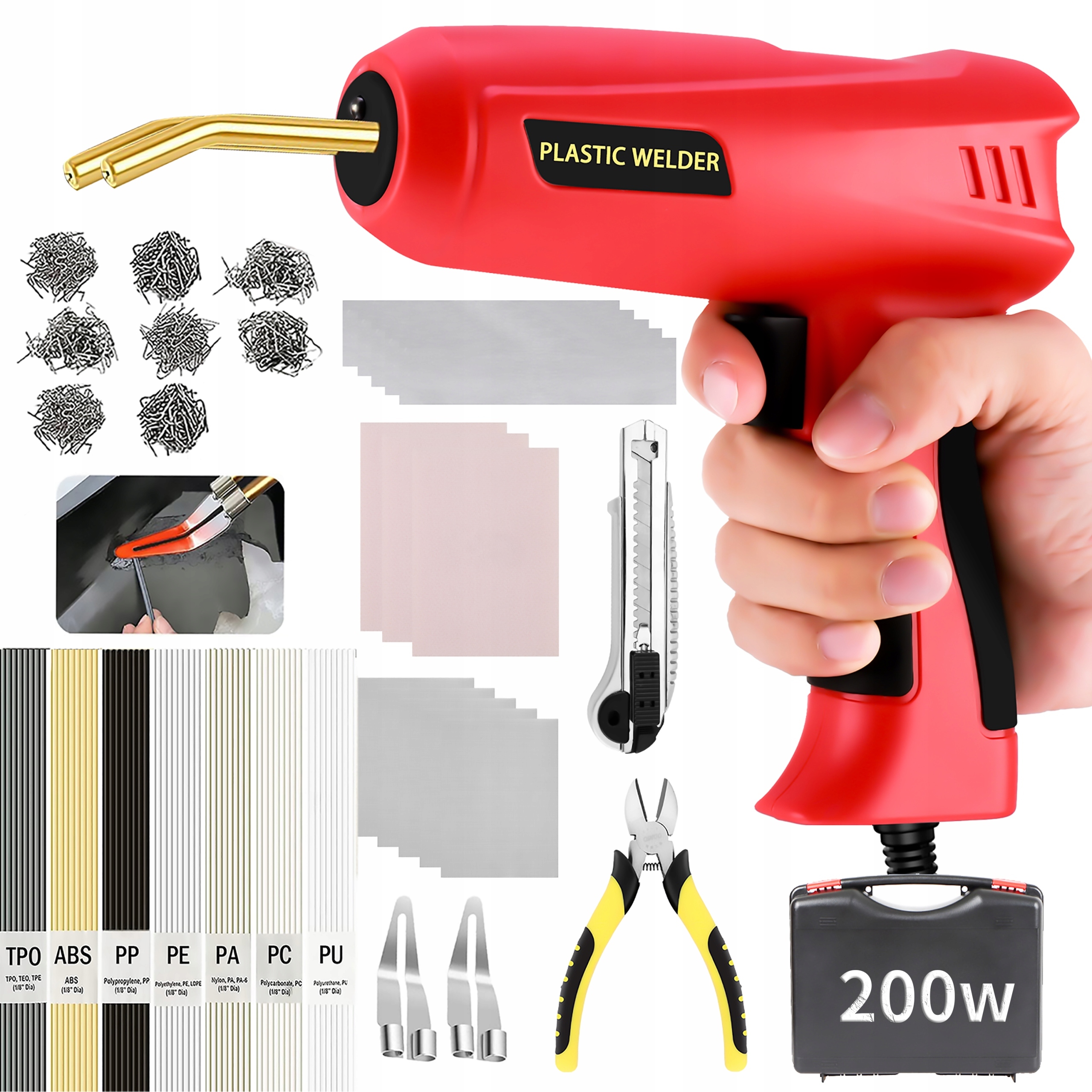 [Быстрый нагрев 200 Вт]: пластиковая сварочная горелка имеет мощность 150 Вт, которая является более мощной и нагревается быстрее, чем другие сварочные горелки, представленные на рынке. Использование тепла для вживления скоб или пластиковых палочек в пластик не повреждает автомобиль или пластиковые поверхности и очень прочно.