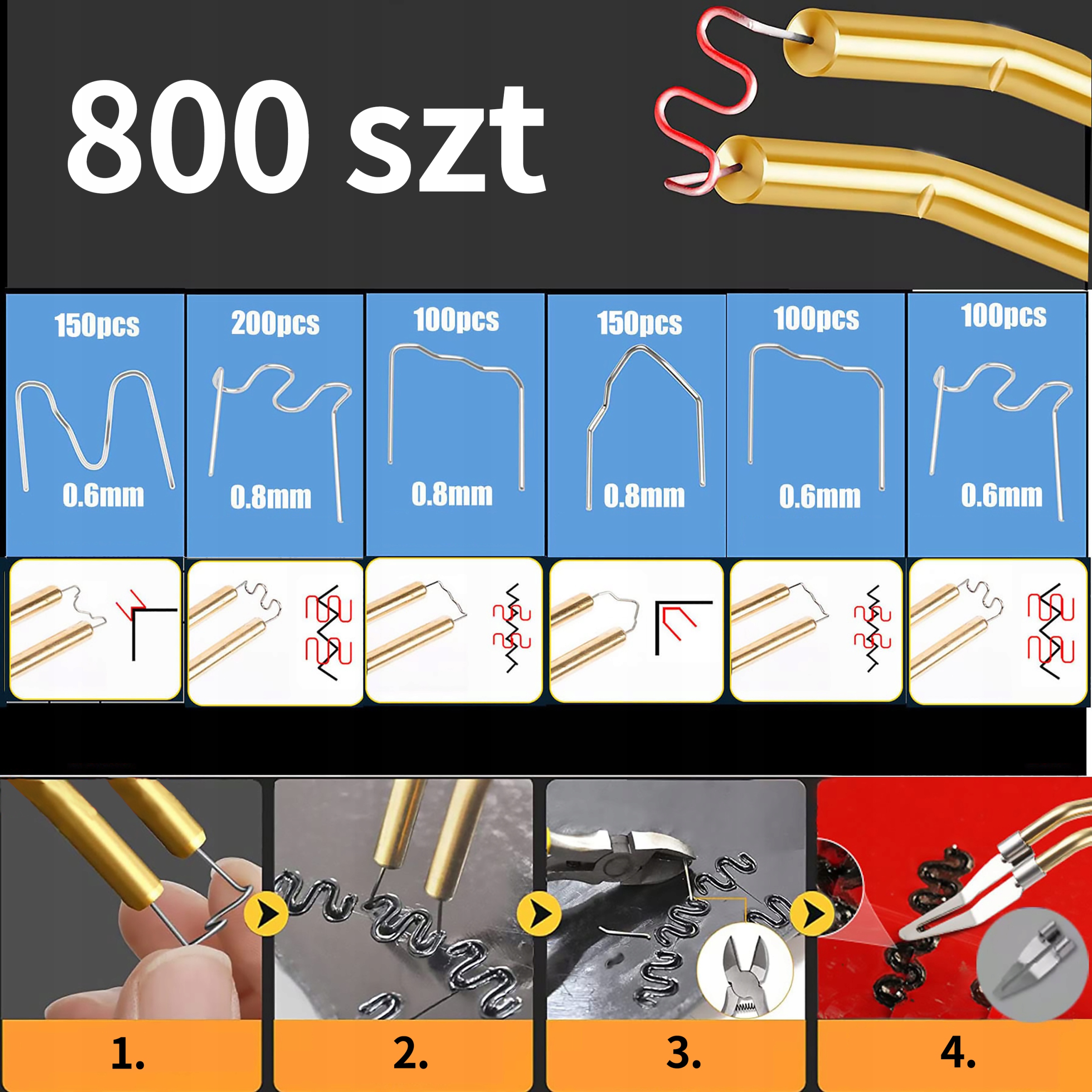 6 видов сварочных штифтов, всего 800 штук, диаметром 0,6 мм и 0,8 мм двух размеров, полностью удовлетворяют различные потребности в сварке. Скобы V-образной формы решают проблему внутреннего угла, скобы M-образной формы решают проблему внешнего угла, а две другие скобы решают проблему плоскости. После ремонта он устойчив к ударам и эффективно продлевает срок службы.