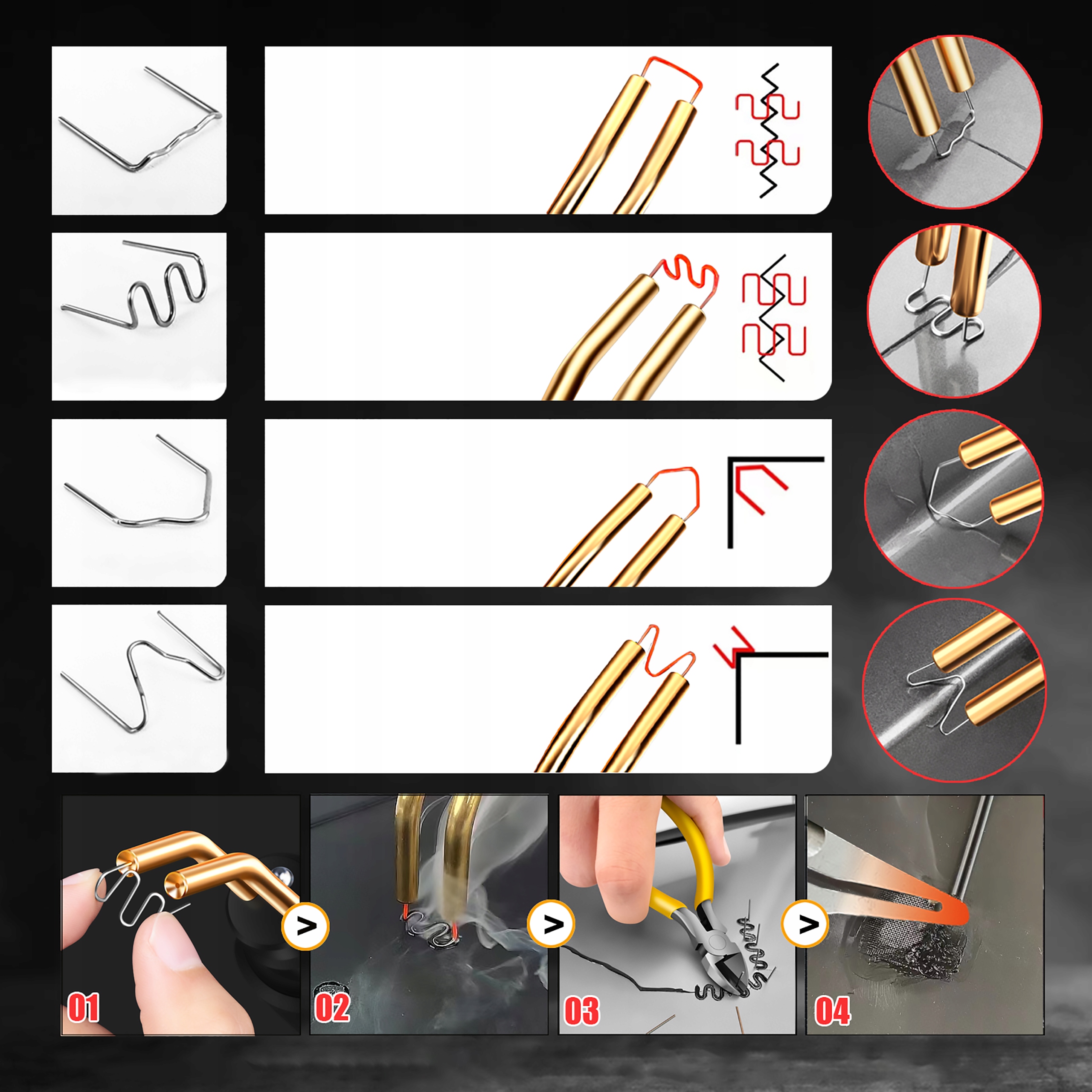 0,6 мм и 0,8 мм двух размеров полностью соответствуют вашим различным потребностям в сварке. Скобы V-образной формы решают проблему внутреннего угла, скобы M-образной формы решают проблему внешнего угла, а две другие скобы решают проблему плоскости. После ремонта он ударопрочен и эффективно продлевает срок службы.