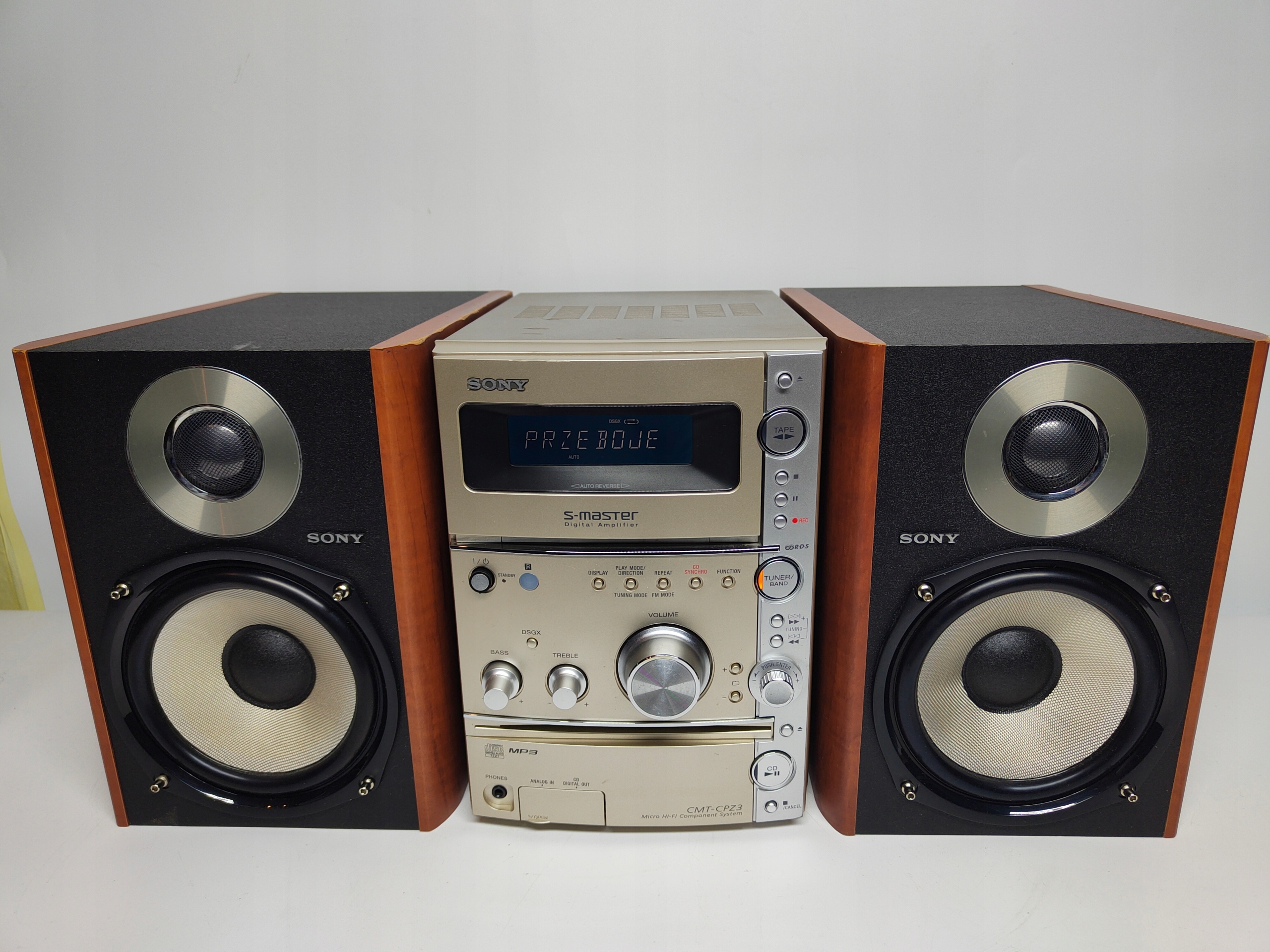 Б/у, функциональная стереосистема SONY HCD-CPZ3 с динамиками. Пульта дистанционного управления нет, но большая часть функций вынесена на переднюю панель. Все работает так, как должно. Есть ресивер, магнитофон с автореверсом и проигрыватель компакт-дисков, способный воспроизводить файлы MP3. Визуально сама башня в хорошем состоянии, за исключением верхней кромки кармана для магнитофона, имеющей серьезные следы использования. Корпуса динамиков в некоторых местах имеют потёртые края и вмятины на корпусе. Сами динамики в очень хорошем состоянии и играют очень хорошо.