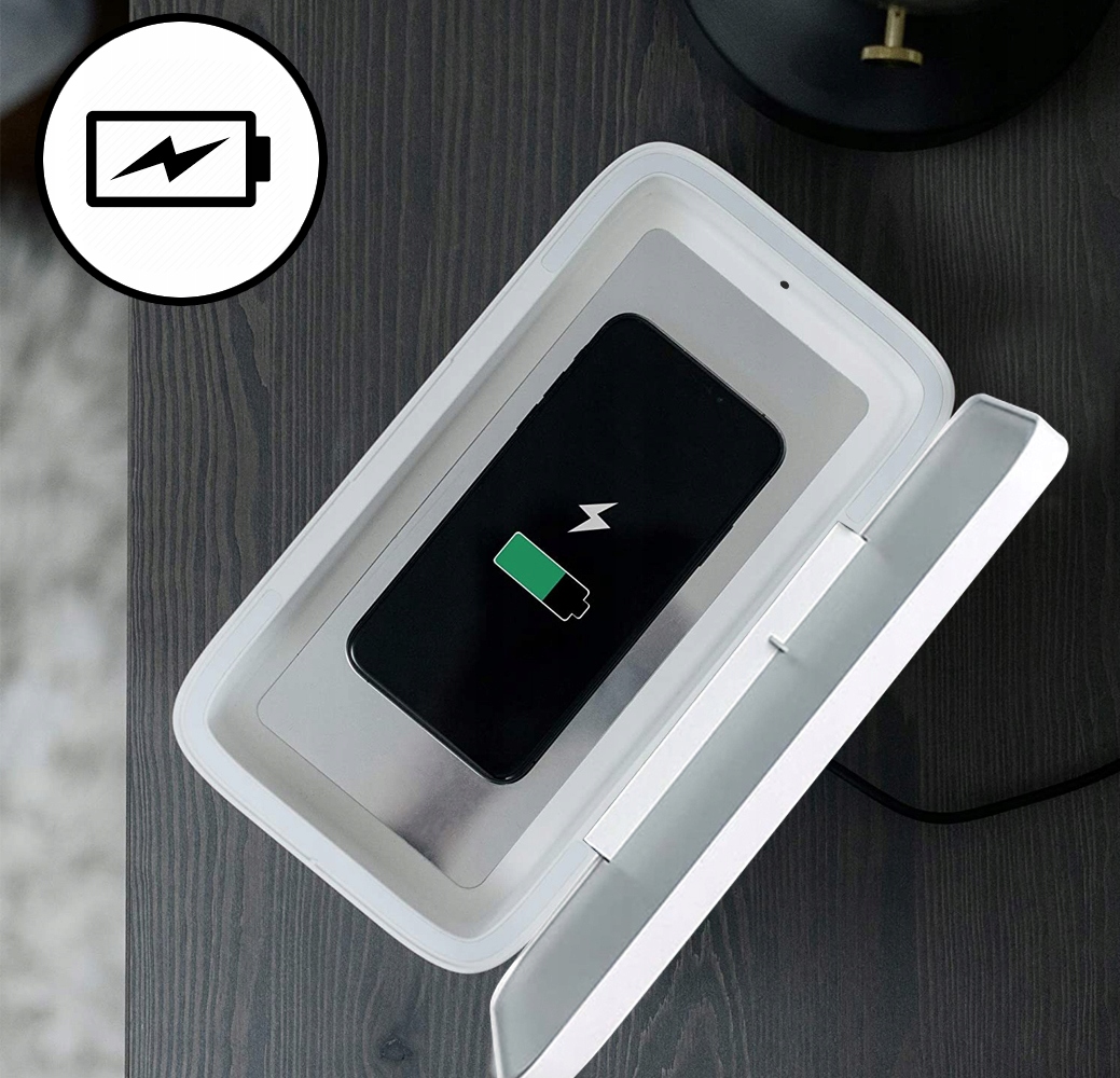 ✅ УФ-С стерилизатор с функцией беспроводной зарядки (5 Вт). Устройство чрезвычайно эффективно, убивая до 99,9% бактерий. Он работает очень быстро, так как стерилизация занимает всего 6–10 минут.