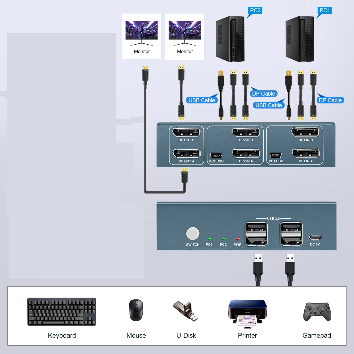 - KVM USB 2.0 Переключатель с 4 портами: Этот переключатель USB HDMI KVM с двумя мониторами имеет 4 порта USB 2.0 и поддерживает соединительные устройства с портом USB 2.0. Они могут предоставить USB-диск, мышь, клавиатуру, принтер, веб-камеру и т. Д. Это удобное и быстрое решение, которое экономит еще больше места. ПРИМЕЧАНИЕ. Это устройство не поддерживает сокращения переключения.