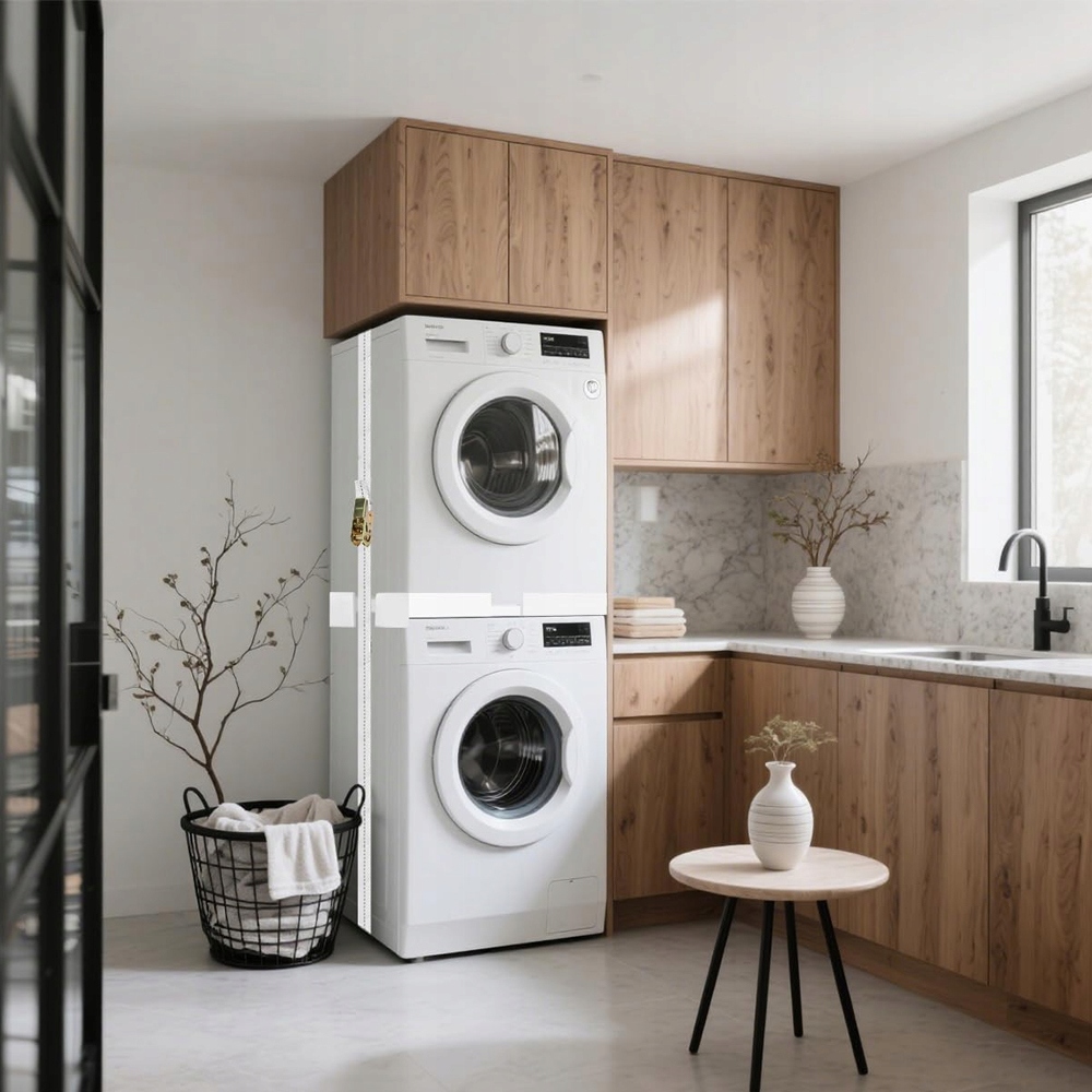 Установка без сверления экономит ценное пространство в вашей прачечной, освежая ее внешний вид. Безопасно разместив сушильную машину на стиральной машине, вы сможете максимально эффективно использовать вертикальное пространство, сохраняя порядок и повышая эффективность. Толщина рамы всего 1,5 см, поэтому дополнительного места она не занимает.