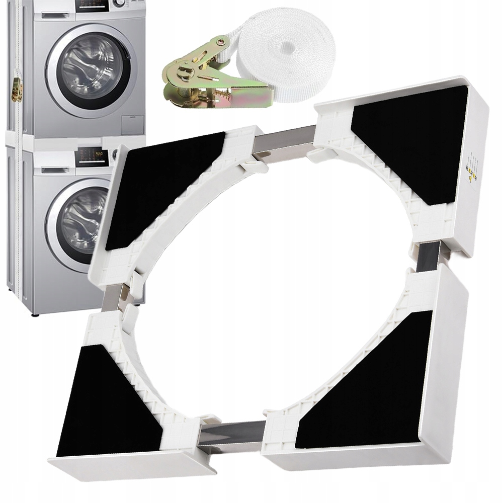Оснащен 8 предустановленными противоскользящими накладками (по 4 сверху и снизу), которые эффективно снижают вибрацию и перемещение устройств во время работы, защищая их от повреждений и обеспечивая более тихую и стабильную работу. Прикрепленный ремень крепления дополнительно предотвращает смещение стиральной машины и сушилки во время отжима, повышая безопасность использования.