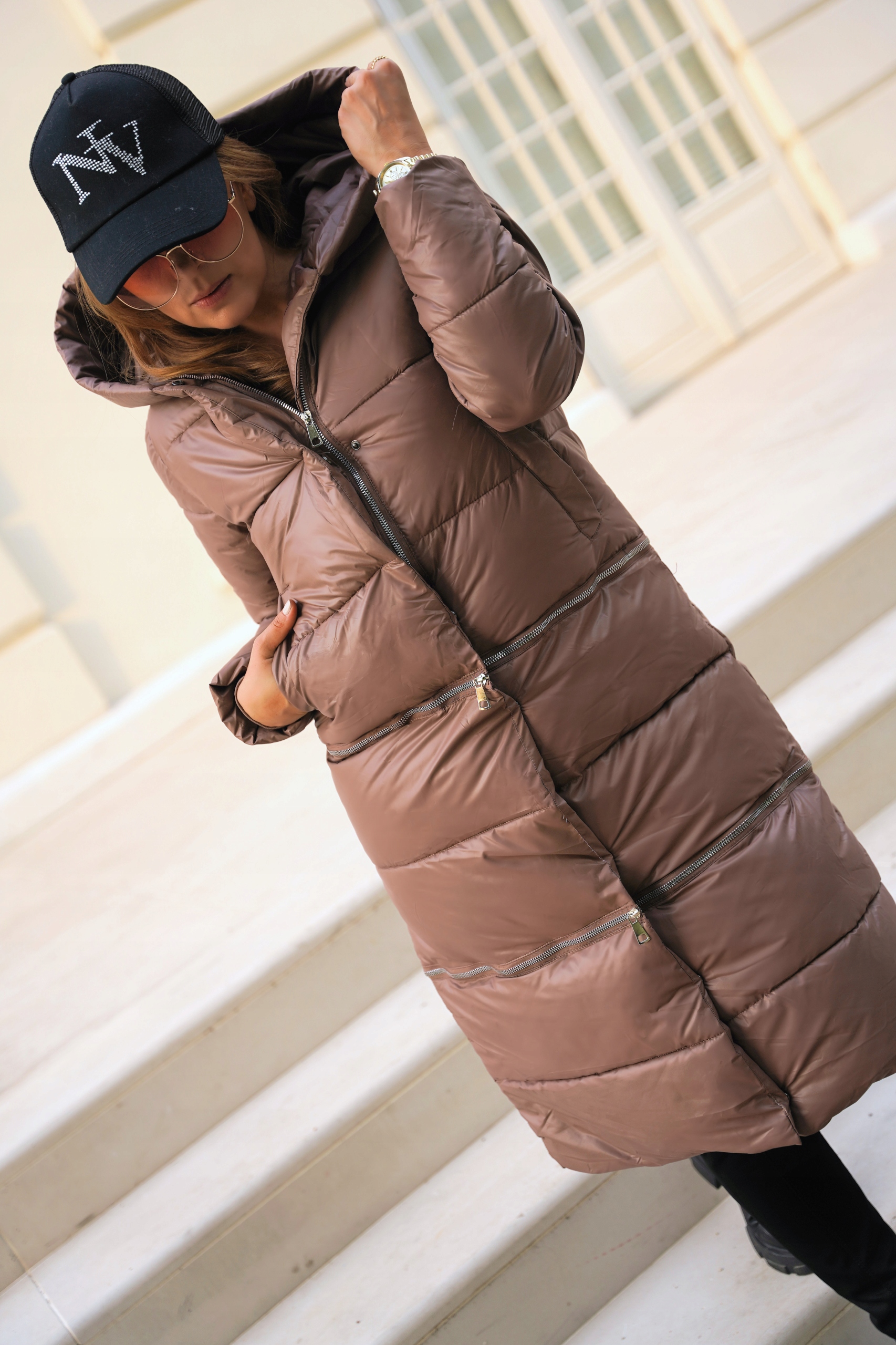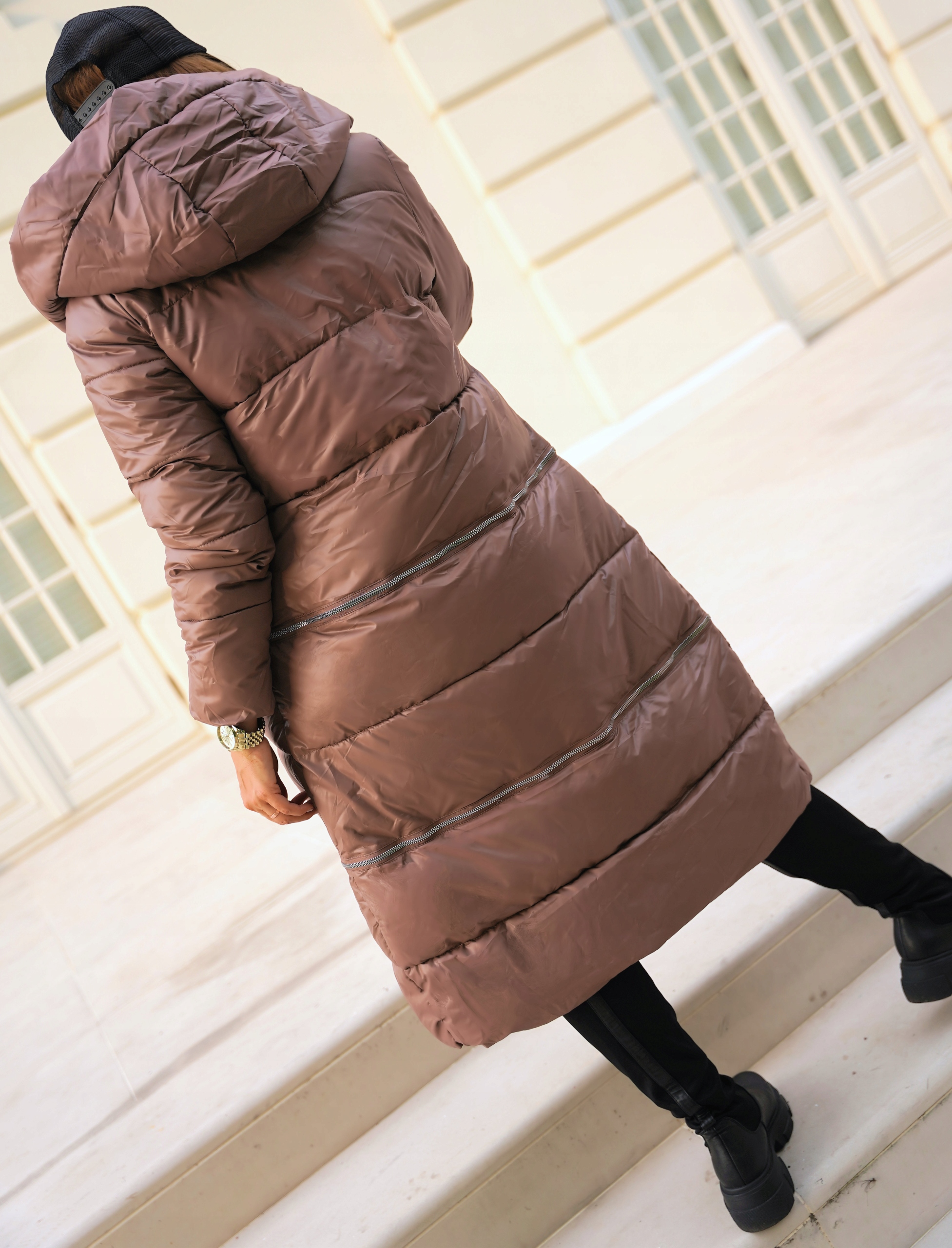 ДЛИННОЕ СТЕГАНОЕ ЗИМНЕЕ ПАЛЬТО С КАПЮШОНОМ;
