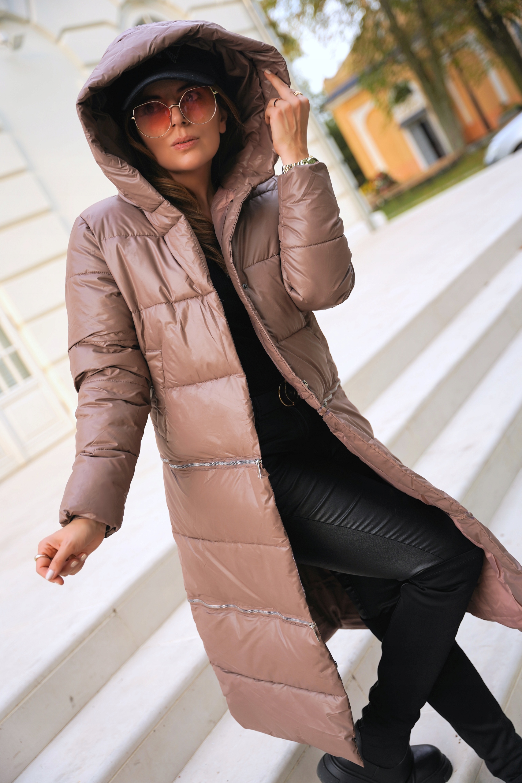- Пальто застегивается на молнии и кнопках под подбородком;