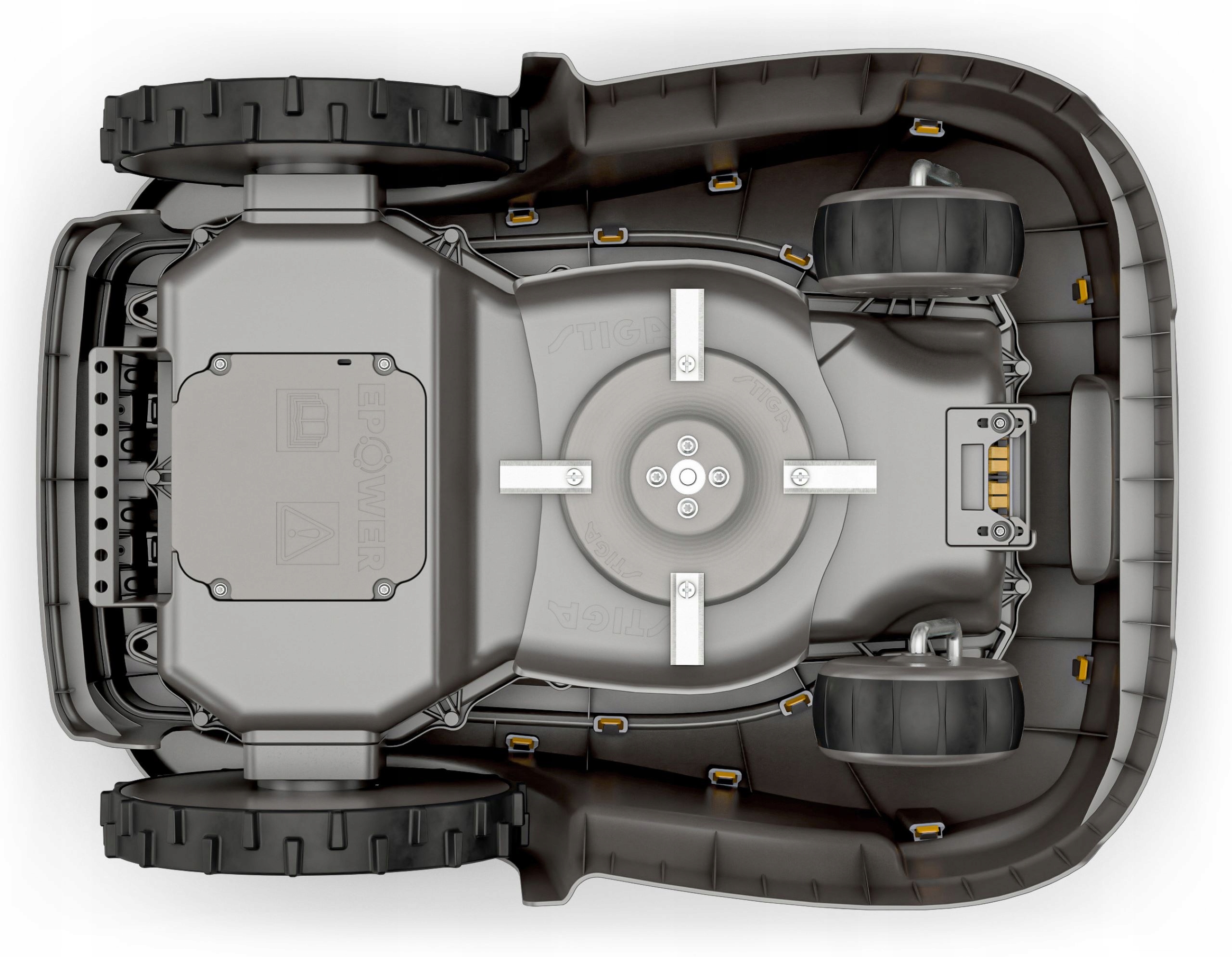 Робот оснащен аккумулятором ePower емкостью 5 Ач, что позволяет ему работать на площади до 1200 м2 на одном заряде. Тщательно продуманное расположение аккумулятора между двумя задними колесами положительно влияет на центр тяжести, создавая баланс, который позволяет роботупреодолевать уклоны до 45% (24°). Дизайн достаточно легкий и не оставляет следов на газоне.