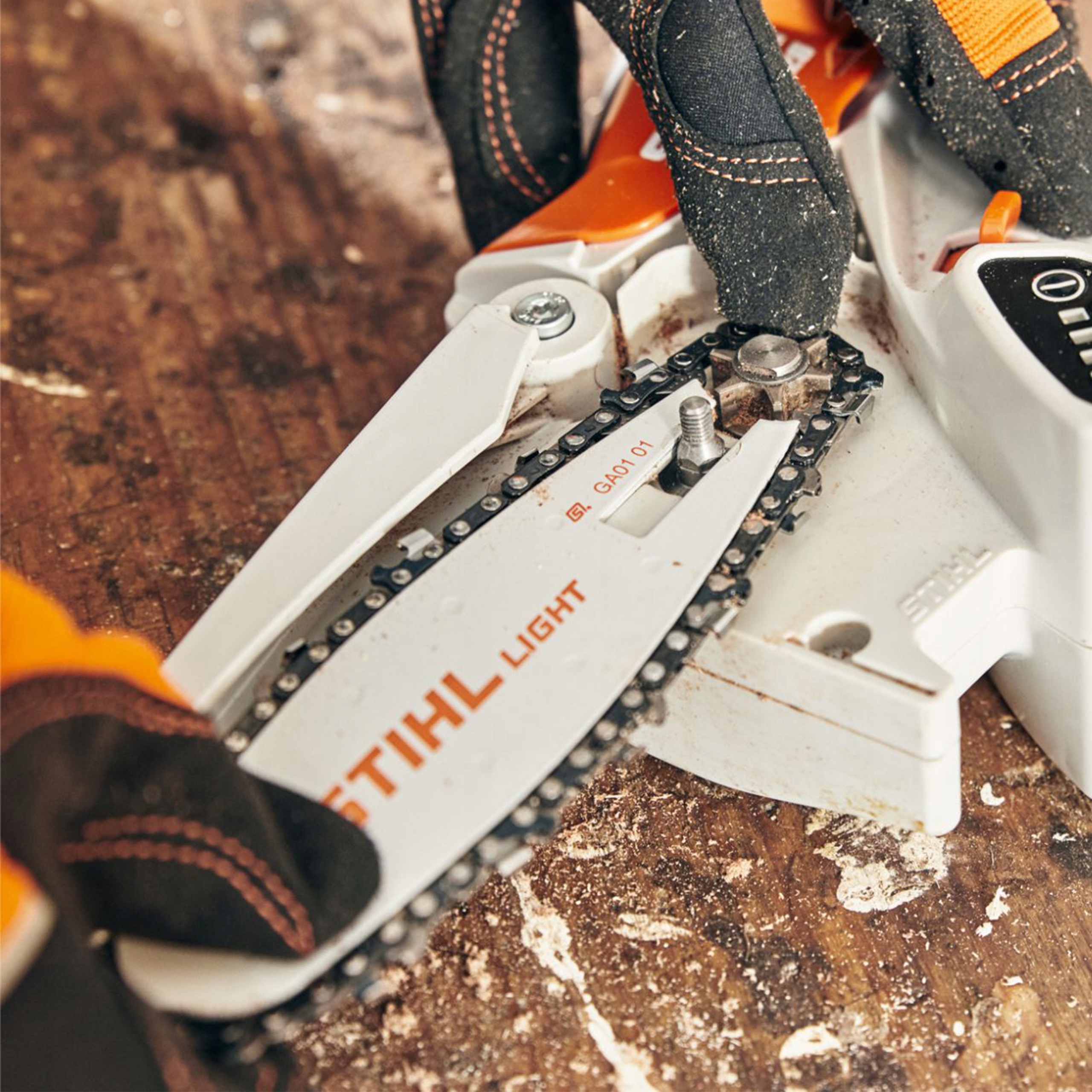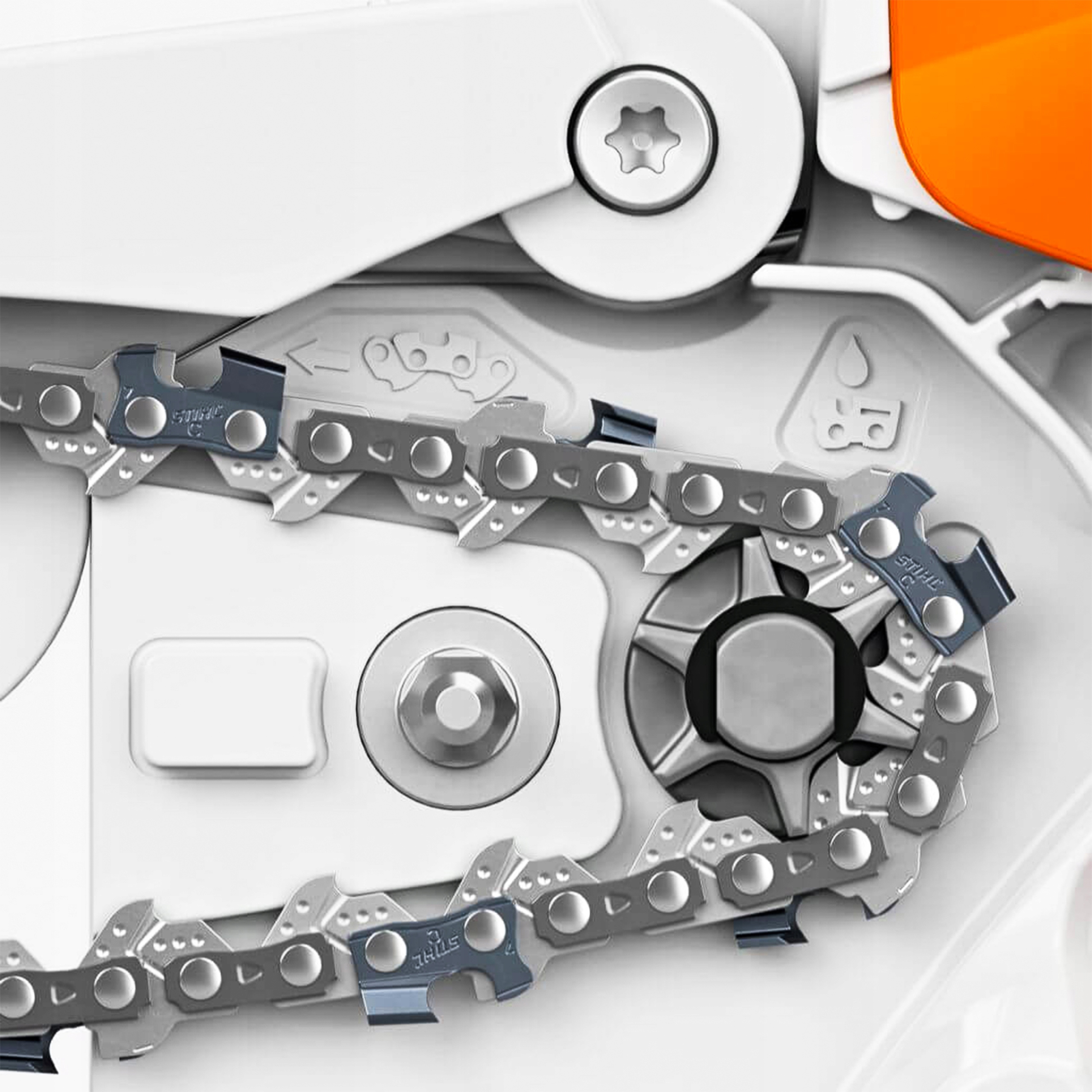 благодаря крышке приводного колеса со встроенной гайкой. Изменять бензопилу очень просто. Не нужно использовать инструменты. Ручное затягивание цепной пилы не требуется.