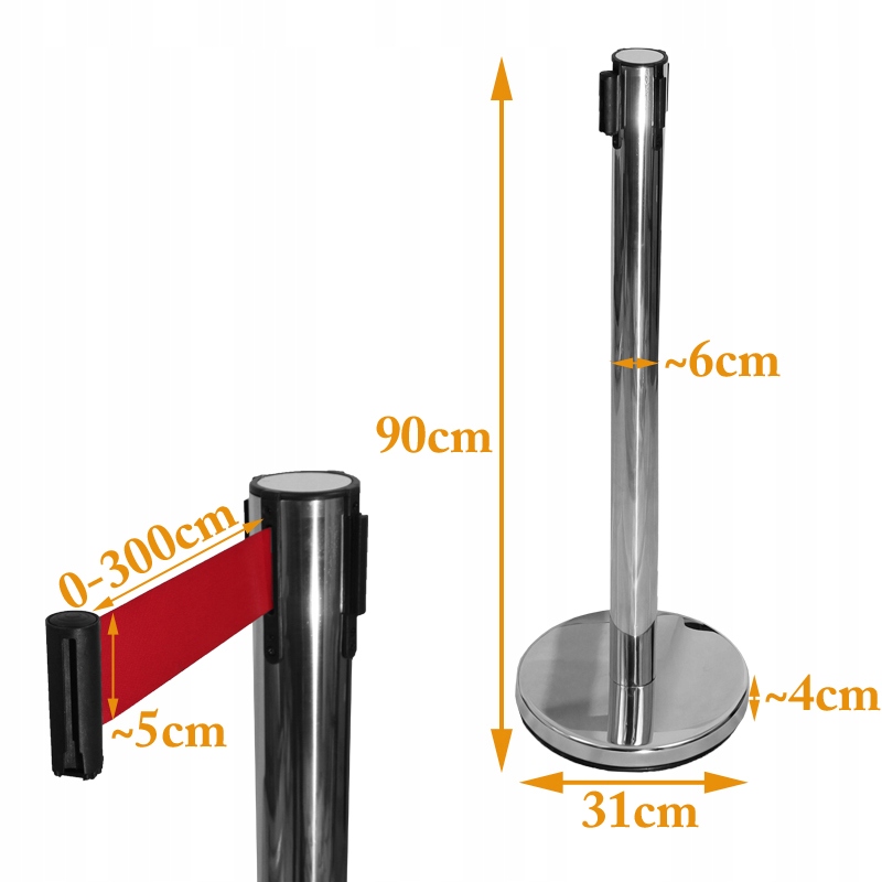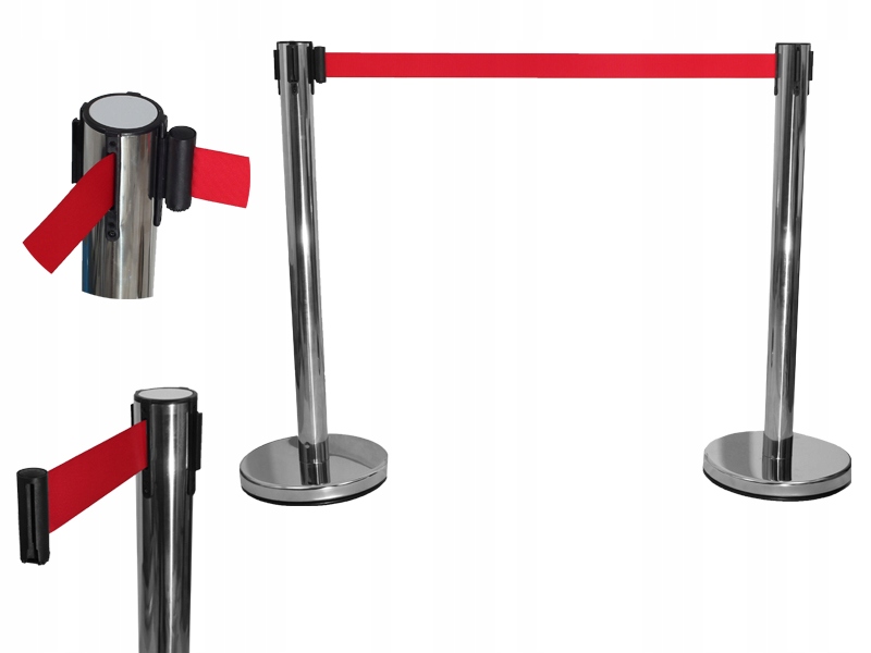 Столбы изготовлены из металла, имеют автоматическую систему намотки ленты красного цвета, длиной 3 м.