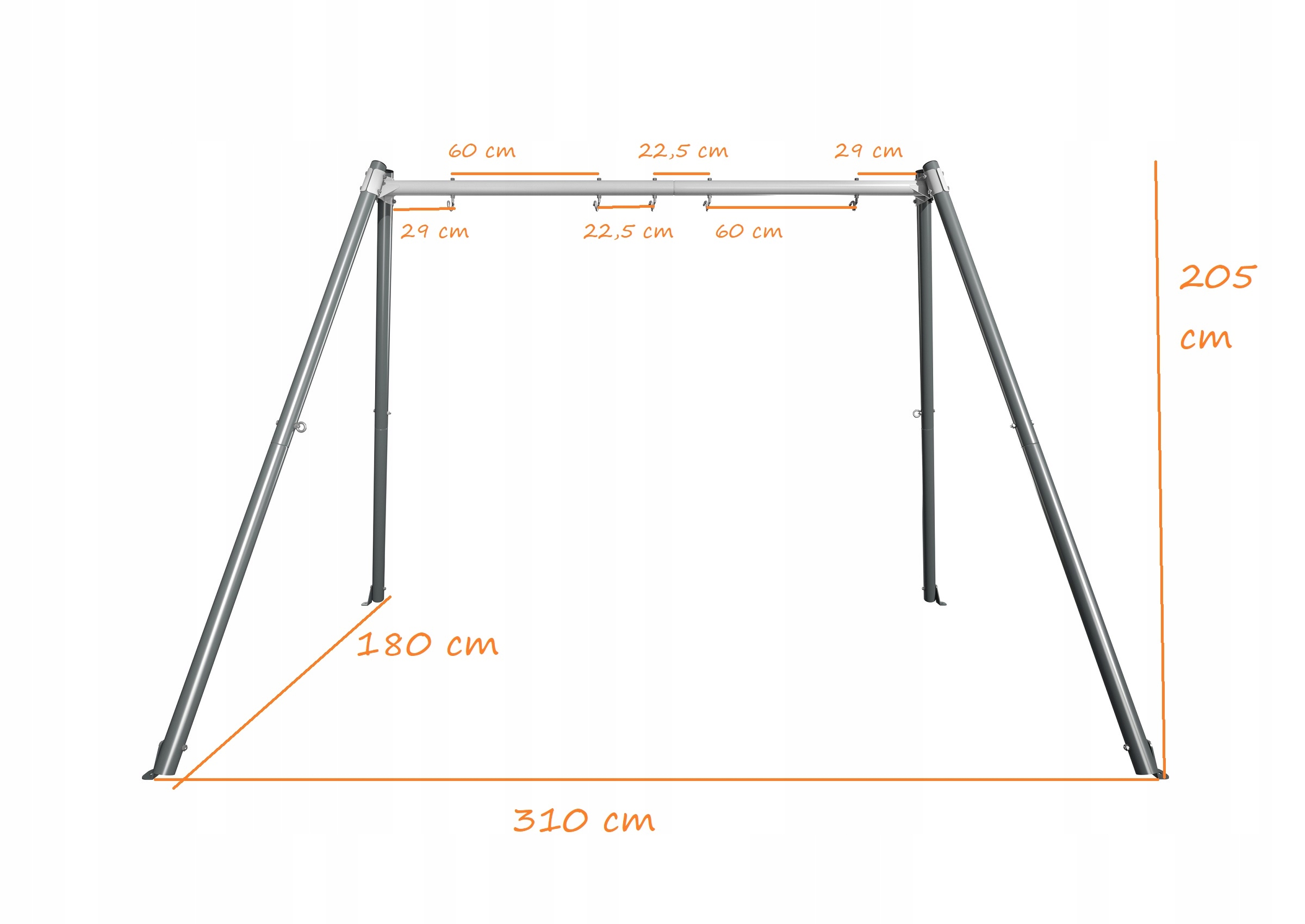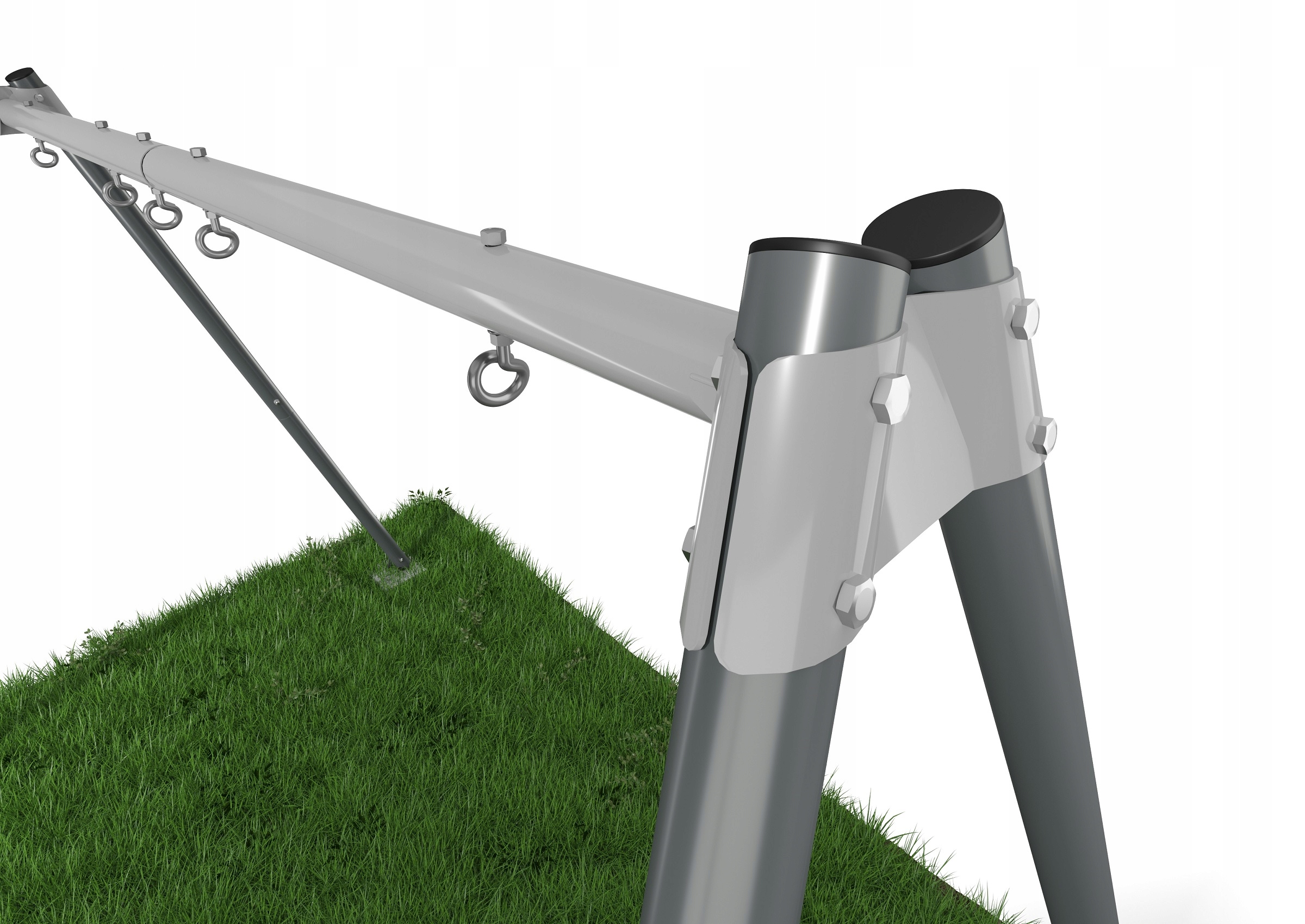 Такая конструкция обеспечивает высокую прочность а жесткость при отклонении качелей также обусловлена соответствующими углами ножек рамы.