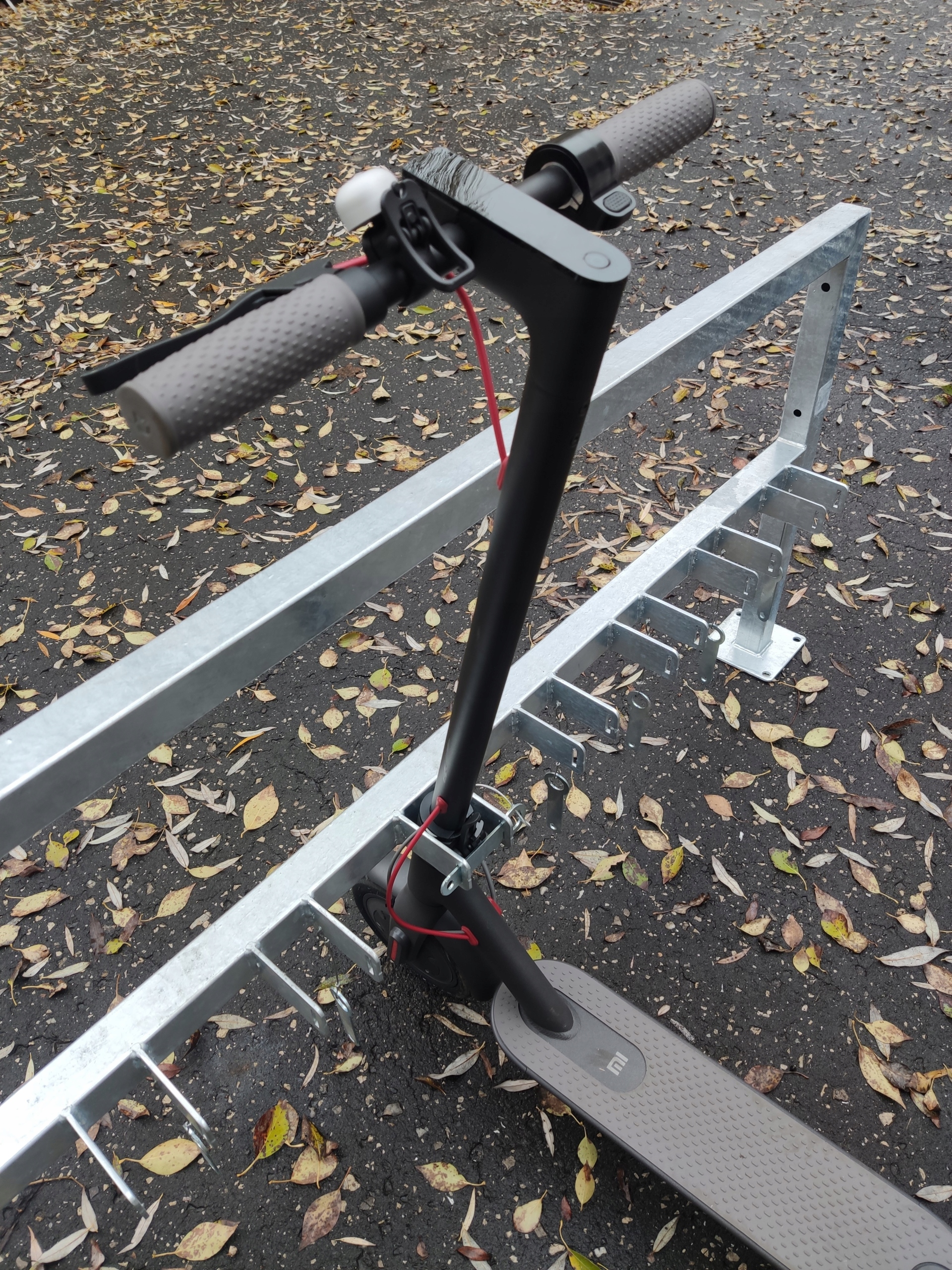 Подставка для самокатов П-образного типа с перекладиной – Наш продукт был создан с учетом растущей популярности путешествий на таком транспортном средстве, как самокат. В период, когда количество велостоянок достаточно велико и припарковать самокат проблематично, в нашей компании появляется идея парковки самоката. Стенд с высокой гарантией безопасности и возможностью защитить самокат от кражи. Чтобы закрепить самокат, достаточно иметь при себе небольшой навесной замок – поместив руль самоката в держатели, вставьте ключ и закрепите его навесным замком, либо припаркуйте самокат и прикрепите его своим замком к среднему профилю. Подставка оцинкована горячим способом, что гарантирует самую надежную антикоррозийную защиту, доступную на рынке. Наш продукт адаптирован ко всем типам самокатов, включая электрические.