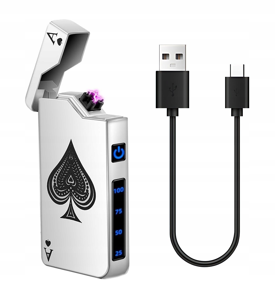 ЗАРЯДНОЕ УСТРОЙСТВО ДЛЯ ПЛАЗМЕННОЙ ЗАЖИГАЛКИ ДВОЙНОЙ ДУГИ USB-C TYPE-C БЕСПЛАМЕННЫЙ СЕРЕБРЯНЫЙ A