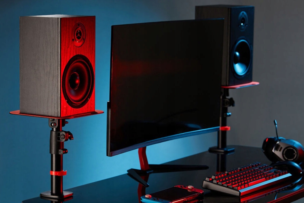 Современный обтекаемый дизайн хорошо сочетается со всеми современными условиями для работы и игр. Основание изготовлено из стали, что обеспечивает высокую устойчивость и несущую способность конструкции (до 15 кг/шт.). Настольный зажим можно крепить даже на толстые столы и покрытия столешниц. Основание имеет противоскользящие накладки из пены EVA, которые дополнительно снижают уровень вибрации, передаваемой стойками. Благодаря этим, казалось бы, незначительным элементам динамики не создают лишнего резонанса, что обеспечивает высокое качество звука. Противоскользящие накладки также защищают стойки от скольжения по основанию.