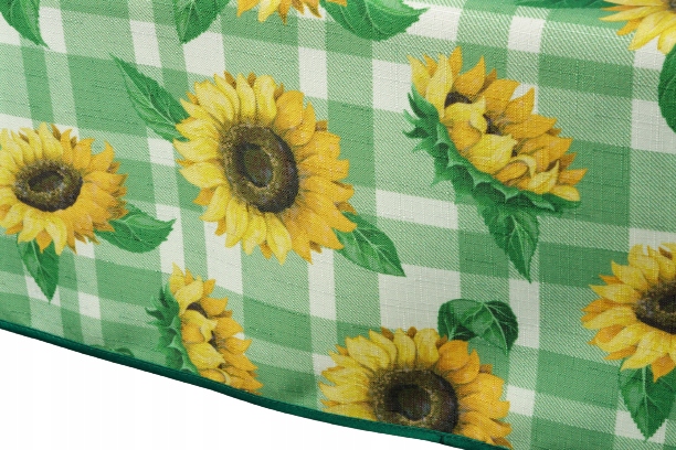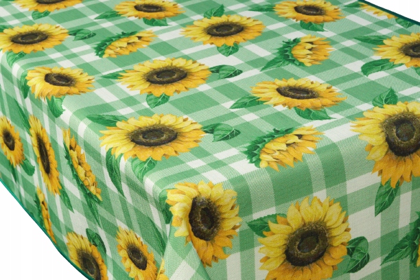 Стенка почти идентична льняной ткани с золотой, великолепной подсолнечниками на фоне зеленой решетки. Идеальная скатерть для кухни, сада, на террасу, для комнаты.