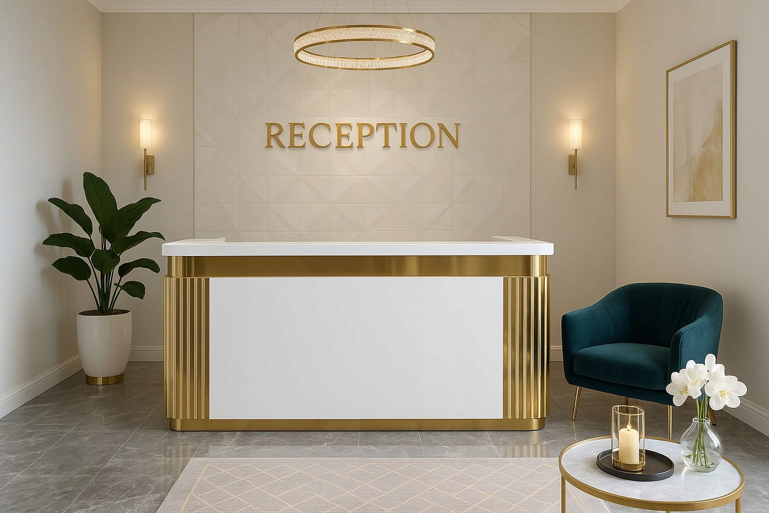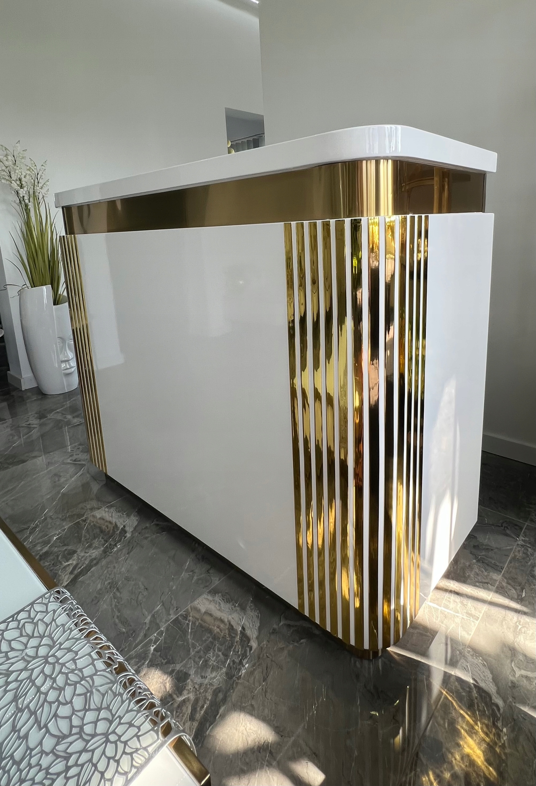 Эта стойка регистрации для салона красоты и парикмахерской была разработана для мест, которые хотят создать профессиональный имидж. Золотые элементы подчеркивают роскошь, а элегантный фасад с первых секунд привлекает внимание покупателей.