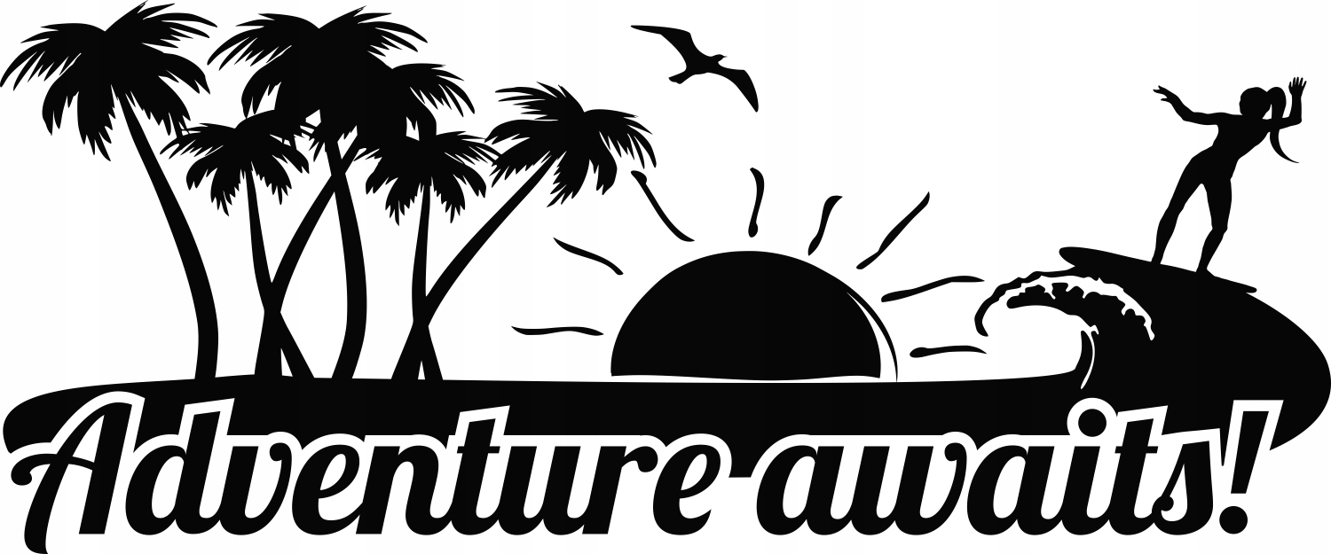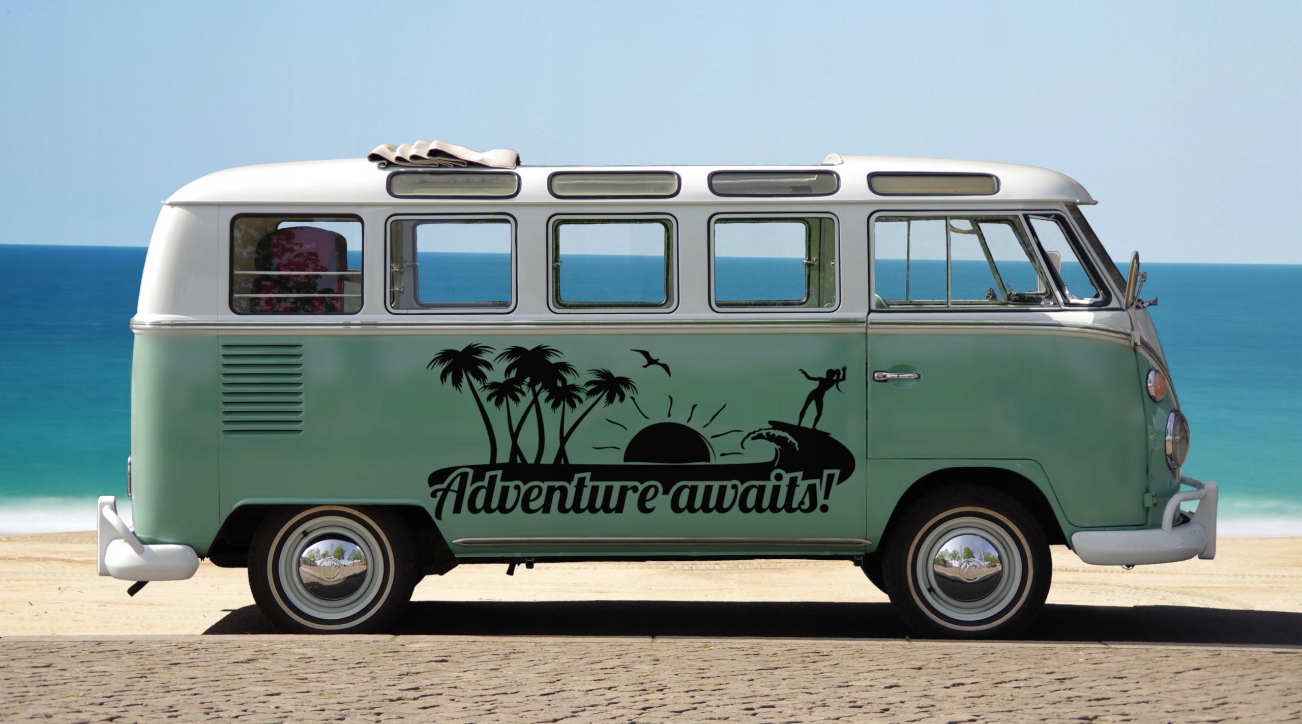 Тематика В предложении представлена наклейка, предназначенная для наклеивания на автомобиль, фургон или кемпер. На нем изображены пальмы, девушка-серфингистка, заходящее солнце и надпись. Наклейка не имеет фона, она вырезана выбранного цвета из матовой самоклеющейся фольги немецкой компании Oracal. После наклейки на автомобиль остаются только элементы, выделенные черным цветом на фото ниже.
