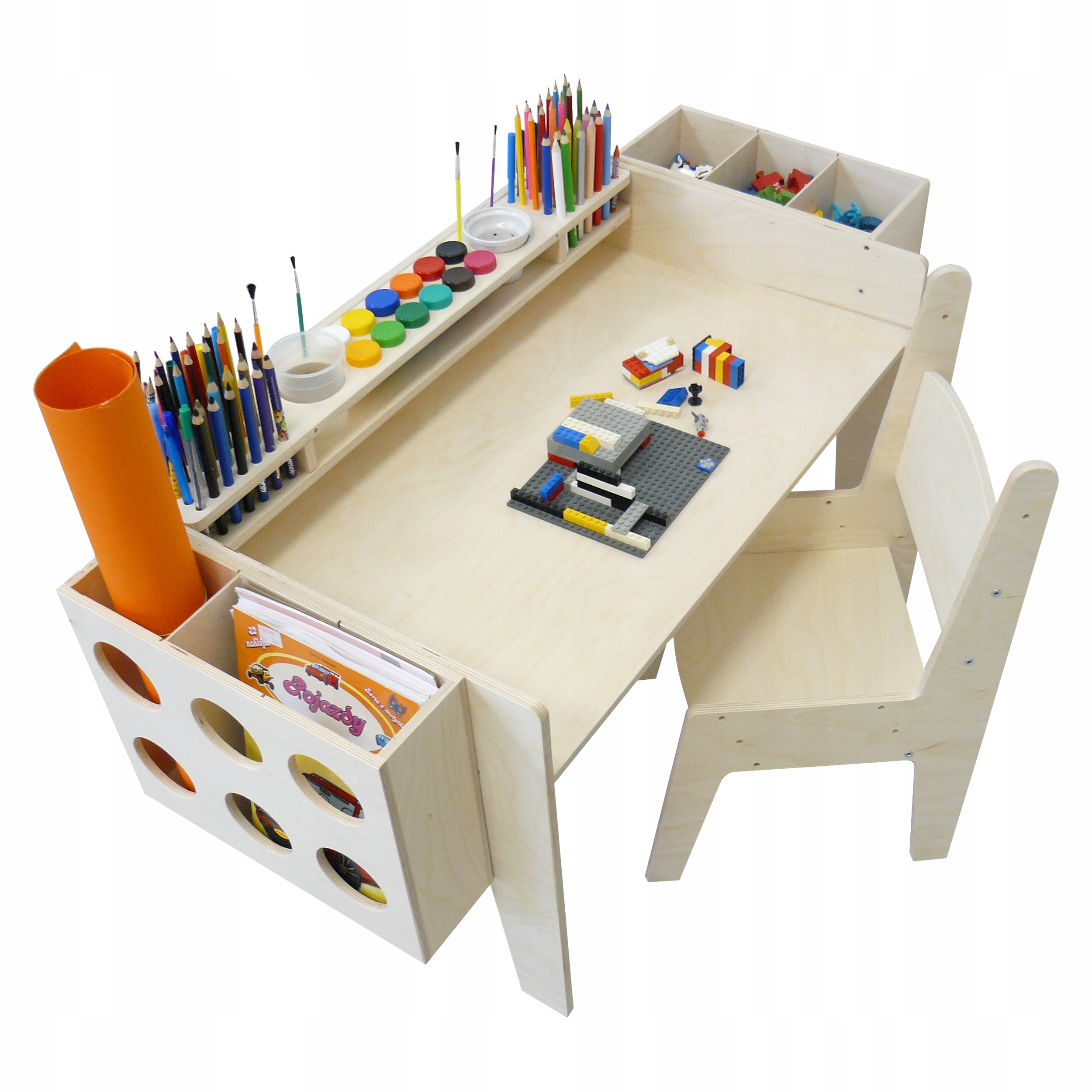 Комплект состоит из стола, стула и трёх органайзеров. Он изготовлен из фанеры, не покрыт лаком. И стол, и стул имеют три уровня регулировки: для малышей, для малышей и для пожилых. В набор входят органайзеры для красок, кистей, стаканчиков для воды, мелков, фломастеров и ручек, листов бумаги и блоков. Благодаря им вам не придется каждый раз тянуться к ящику или пеналу – все под рукой. Наши сортеры можно использовать, пока дети играют – рисуют или раскрашивают. Контейнеры устойчивы и практичны в использовании, а их прочная конструкция позволяет использовать их в течение длительного времени. Каждый мелок можно вставить в отдельное отверстие, чтобы ребенок легко вынул его и поставил на место. Набор прекрасно дополнит мебель детской комнаты, сделав ее интерьер теплым и радостным. Мебель функциональна и не занимает много места. Стул очень удобный, а на столе достаточно места для игры. Ваш ребенок найдет идеальное место, чтобы играть, рисовать и даже есть.