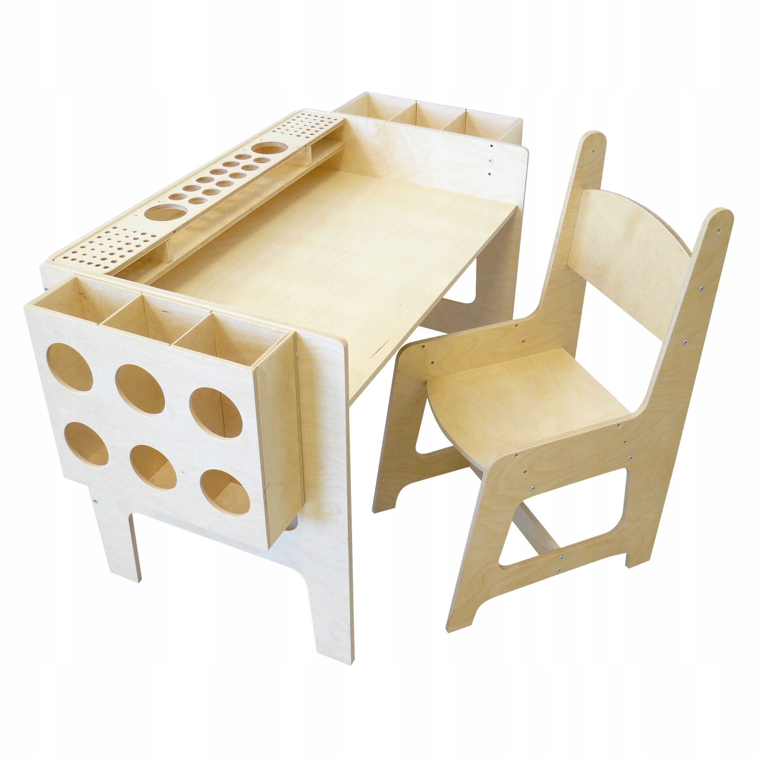 Комплект состоит из стола. , стул и три органайзера. Он изготовлен из фанеры, покрытой бесцветным полуглянцевым лаком. И стол, и стул имеют три уровня регулировки: старший, младший и младший плюс. В набор входят органайзеры для красок, кистей, стаканчиков для воды, мелков, фломастеров и ручек, листов бумаги и блоков. Благодаря им вам не придется каждый раз тянуться к ящику или пеналу – все под рукой. Наши сортеры можно использовать, пока дети играют – рисуют или раскрашивают. Контейнеры устойчивы и практичны в использовании, а их прочная конструкция позволяет использовать их в течение длительного времени. Каждый мелок можно вставить в отдельное отверстие, чтобы ребенок легко вынул его и поставил на место. Набор прекрасно дополнит мебель детской комнаты, сделав ее интерьер теплым и радостным. Мебель функциональна и не занимает много места. Стул очень удобный, а на столе достаточно места для игры. Ваш ребенок найдет идеальное место для игр, рисования и даже приема пищи.
