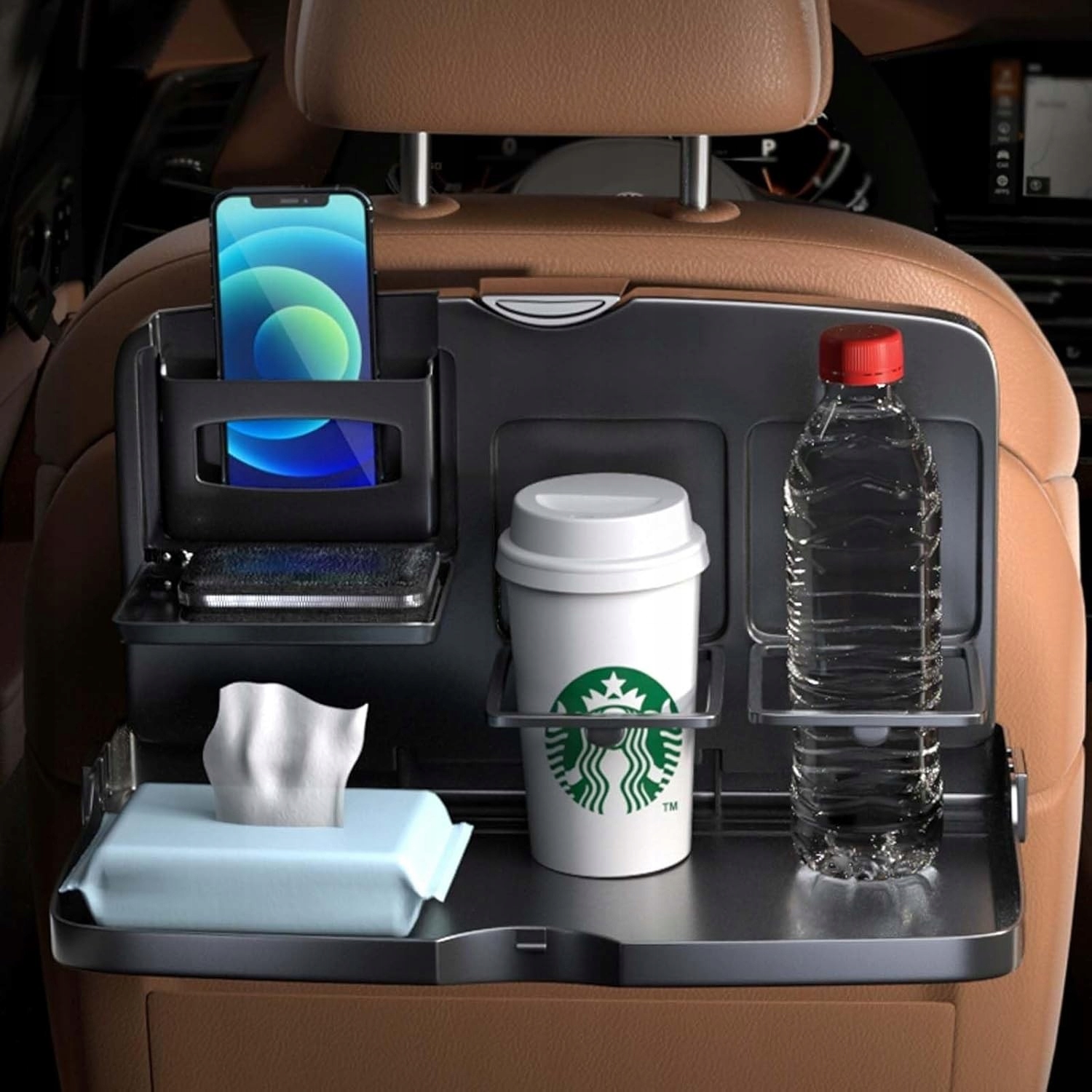 🚗 Практический и портативный: Этот прочный, прочный автомобильный поднос состоит из 2 стаканов, ручка для салфетки или носовых платков, телефона и стола внизу.