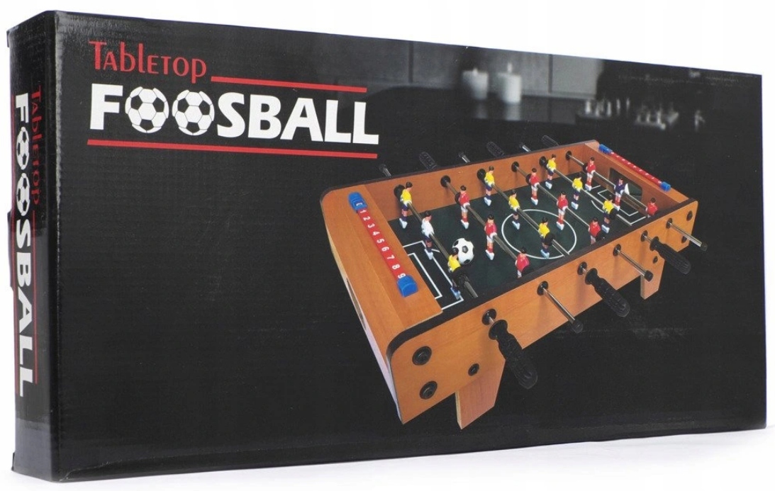 Деревянный стол оснащен 6 металлическими поручнями (по 3 на команду) с эргономичными ручками безопасности, двумя футбольными командами в наборе по три штуки, двумя счетчиками ворот и двумя мячами.