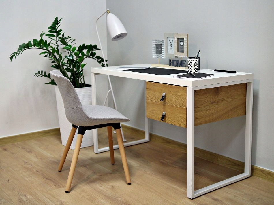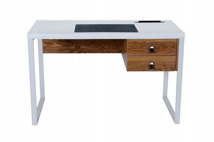 Письменный стол Dirk станет прекрасным дополнением декора домашнего офиса или просто гостиной, где нам нужен место, где мы можем просматривать Интернет перед ноутбуком. Этот современный письменный стол имеет прочную металлическую основу с белым порошковым покрытием. Благодаря использованию металла стол прочный и устойчивый. Белая столешница стола изготовлена из лакированной плиты МДФ с матовой отделкой. Практичным элементом, которым оснащен письменный стол, является противоскользящий коврик, расположенный на поверхности столешницы. Этот коврик позволит вам держать ноутбук или другое оборудование в одном месте, не беспокоясь о его перемещении. Дополнением, которое также может оказаться очень полезным, является слот, который служит подставкой для планшета или телефона. Под столешницей предусмотрено место для двух ящиков с дубовыми фасадами из шпонированной плиты МДФ. В ящиках можно легко разместить необходимые нам документы или другие предметы, к которым у нас будет легкий доступ. Стол Dirk с противоскользящим ковриком выполнен в скандинавском стиле и подойдет и к современному интерьеру.