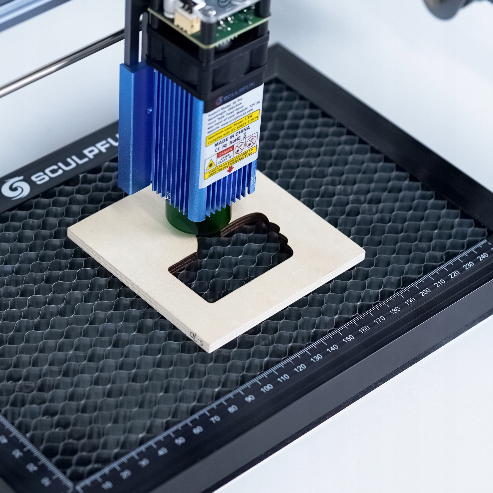 2. Резка по наблюдаемому дизайну: сотовый стол SCULPFUN имеет очень удобную конструкцию для резки и наблюдения. Когда лазер прорезает дерево или акрил, металлическая пластина в нижней части сот излучает яркий свет, что означает, что разрез прошел. Решите проблему, заключающуюся в том, что обычному гравировальному станку трудно определить, режет ли он.