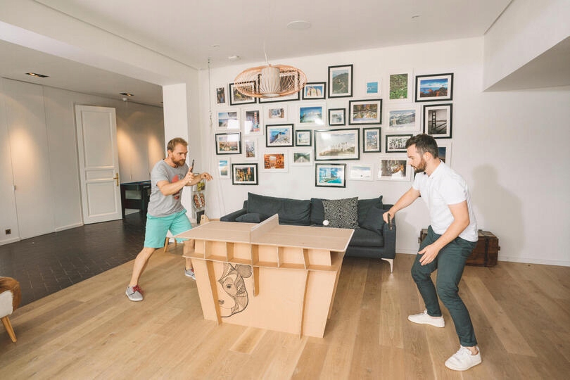 Стол состоит из 7 элементов из армированного крафт-картона и 2 деревянных столешниц. Они соединяются друг с другом через систему прорезей, создавая очень жесткую конструкцию. На сетке и картоне описаны 4 этапа сборки.