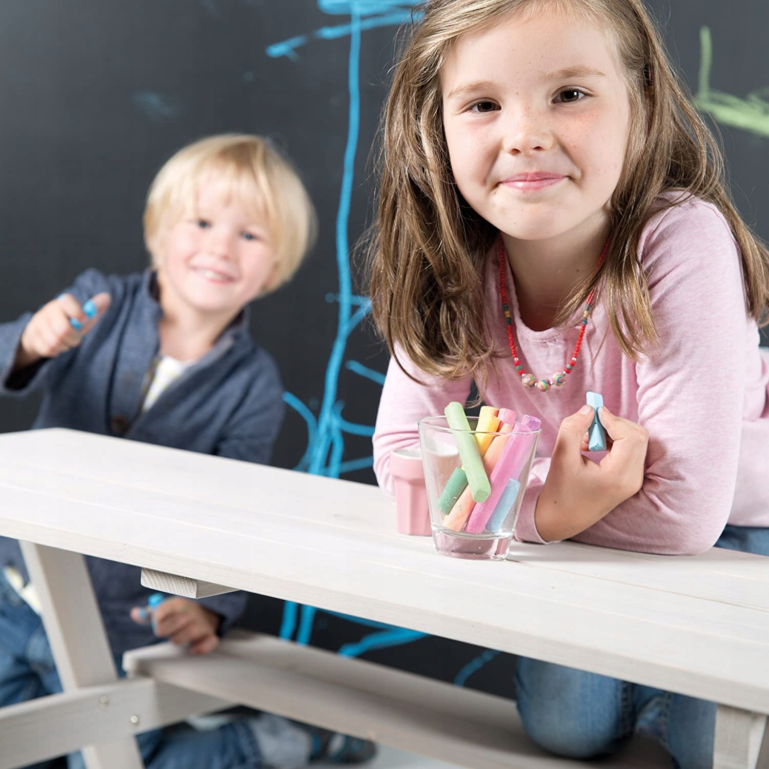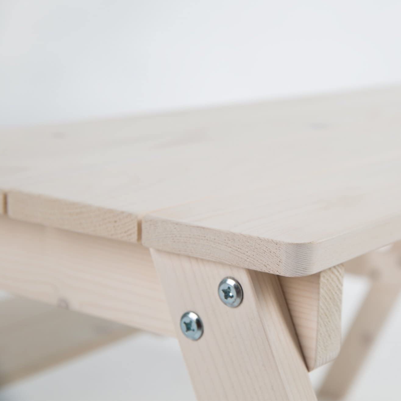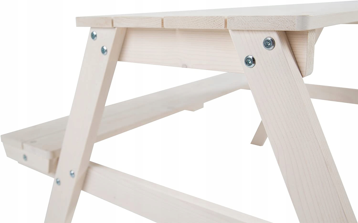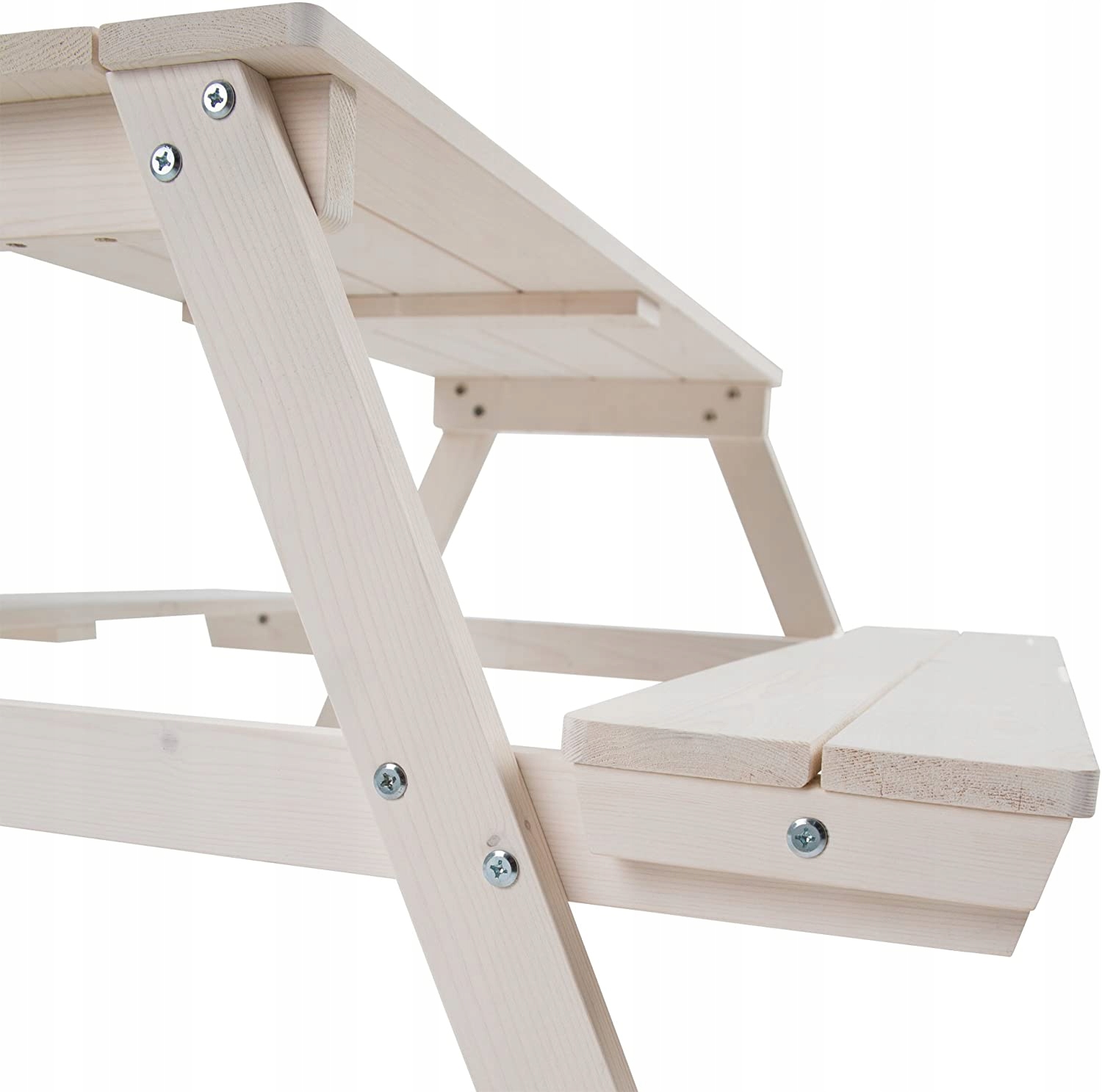 Скамейки высотой 27 см с винтовыми креплениями обеспечивают удобное и безопасное сиденье для детей. Столешница (89х33,5 см) съемная, поэтому дети могут играть с водой и строить замки из песка. Через короткое время столешница возвращается на свое место и ее можно использовать для художественных игр, строительства и рисования в саду, на террасе или даже дома.
