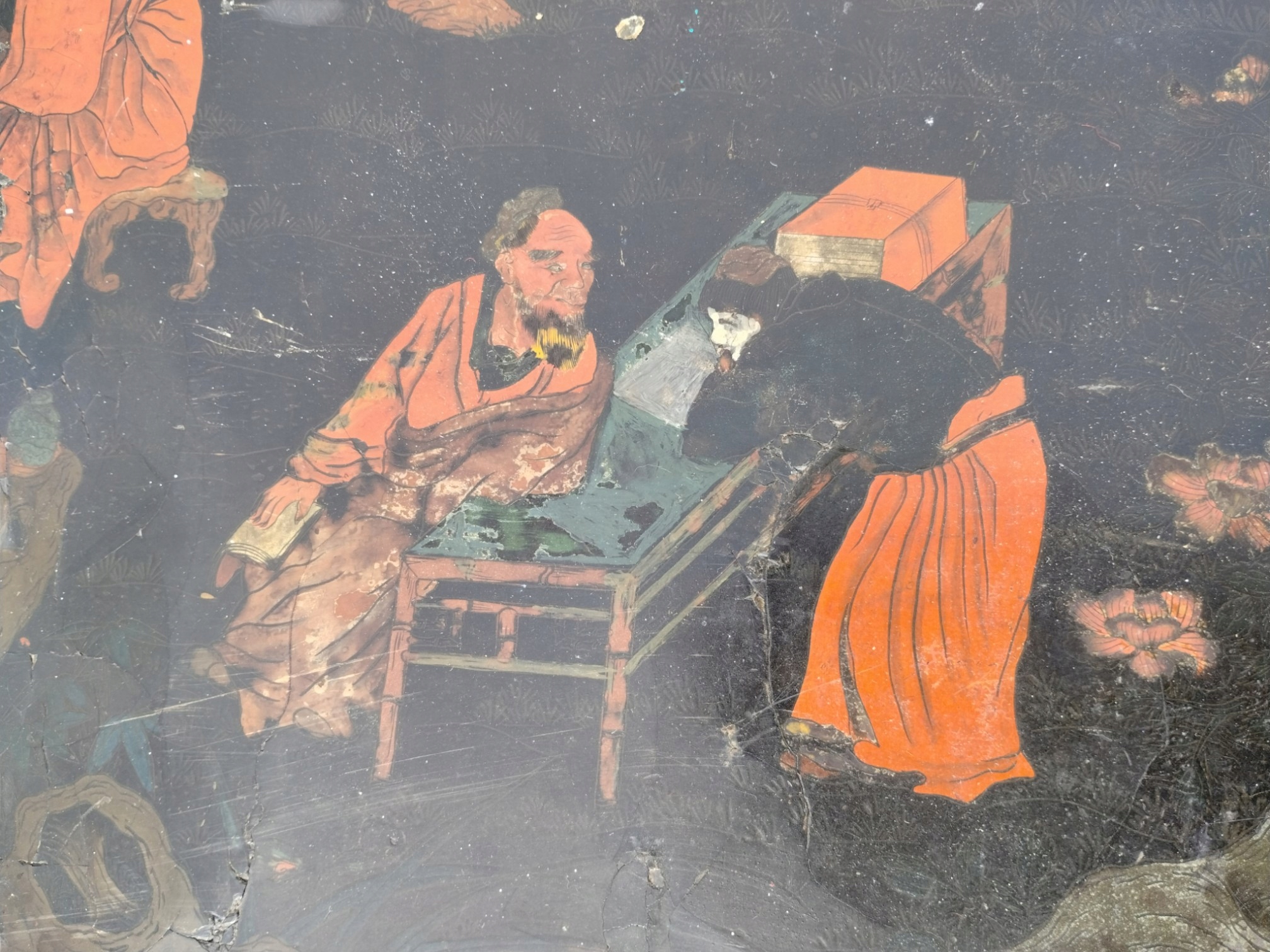 Поверхность столешницы украшена сложной жанровой сценой, изображающей жизнь элиты в садовой обстановке, выдержанной в школьном стиле. Вэньжэньхуа: