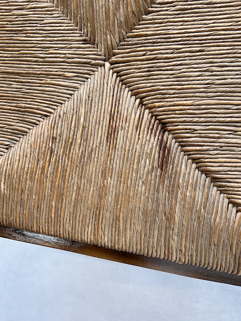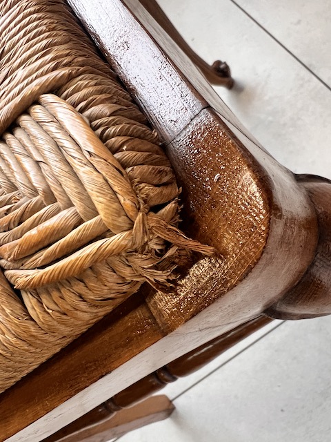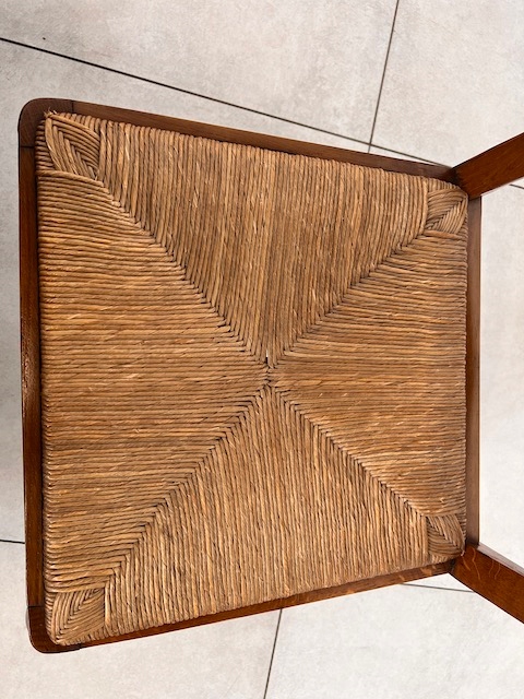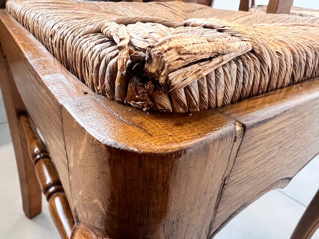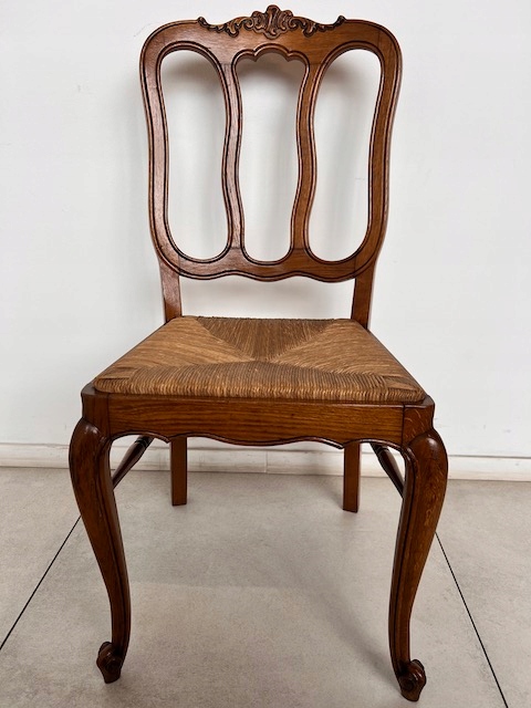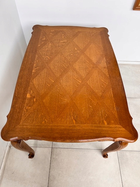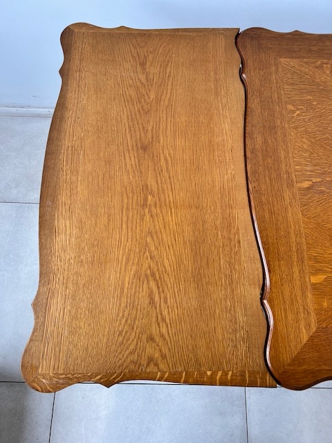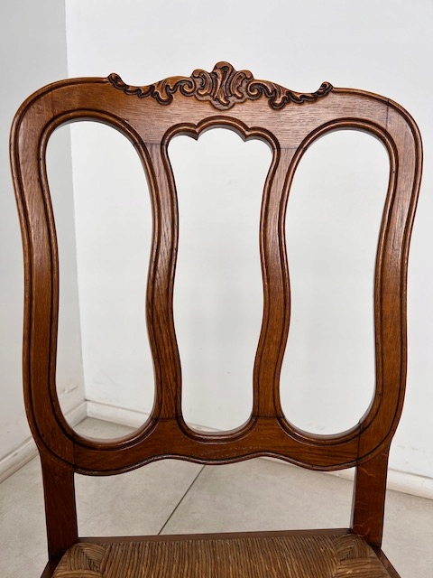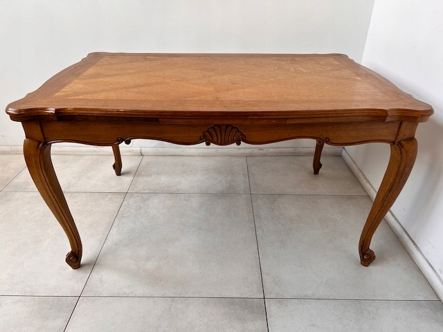 Стол и шесть стульев. Набор выполнен из дуба в стиле Людвик. Стол с прямоугольной столешницей и неправильной формой. Облицовка выполнена в виде привлекательной мозаики. Это не идеально. Стол является выдвижным. Стулья имеют удобные изогнутые спинки. Сиденья тканые. Вероятно, их следует заменить, поскольку у них есть очень незначительные дефекты. Все стулья устойчивы. Комплект не имеет повреждений и дефектов. Имеет типичные следы использования. Он готов к вставке.