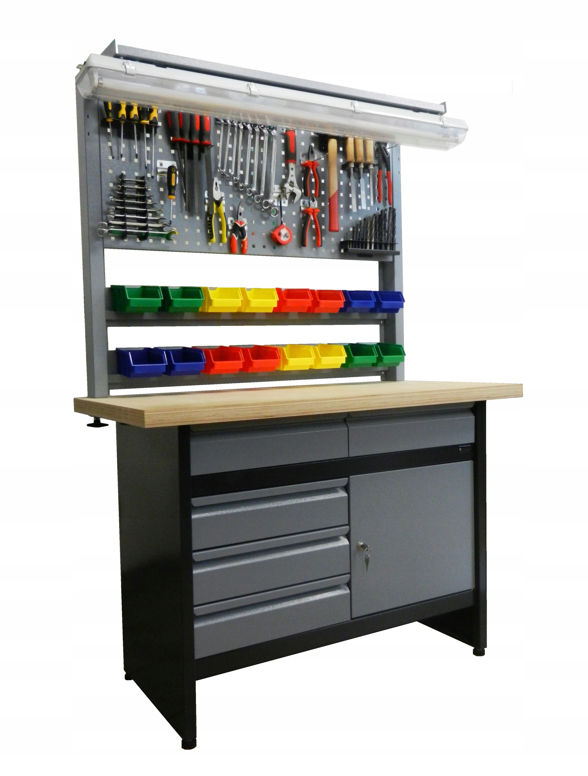 - У него есть вешалка, подвешенная с помощью крючков, позволяя установить любое освещение, например for large eyelets, 1 for small wrenches, 1 for chisels, 1 for screwdrivers, 1 for drills and 9 wire pieces: 3 long (110 mm, fi 4 mm), 3 medium (90 mm, fi 3 mm), 3 short (70 mm, fi 3 mm),