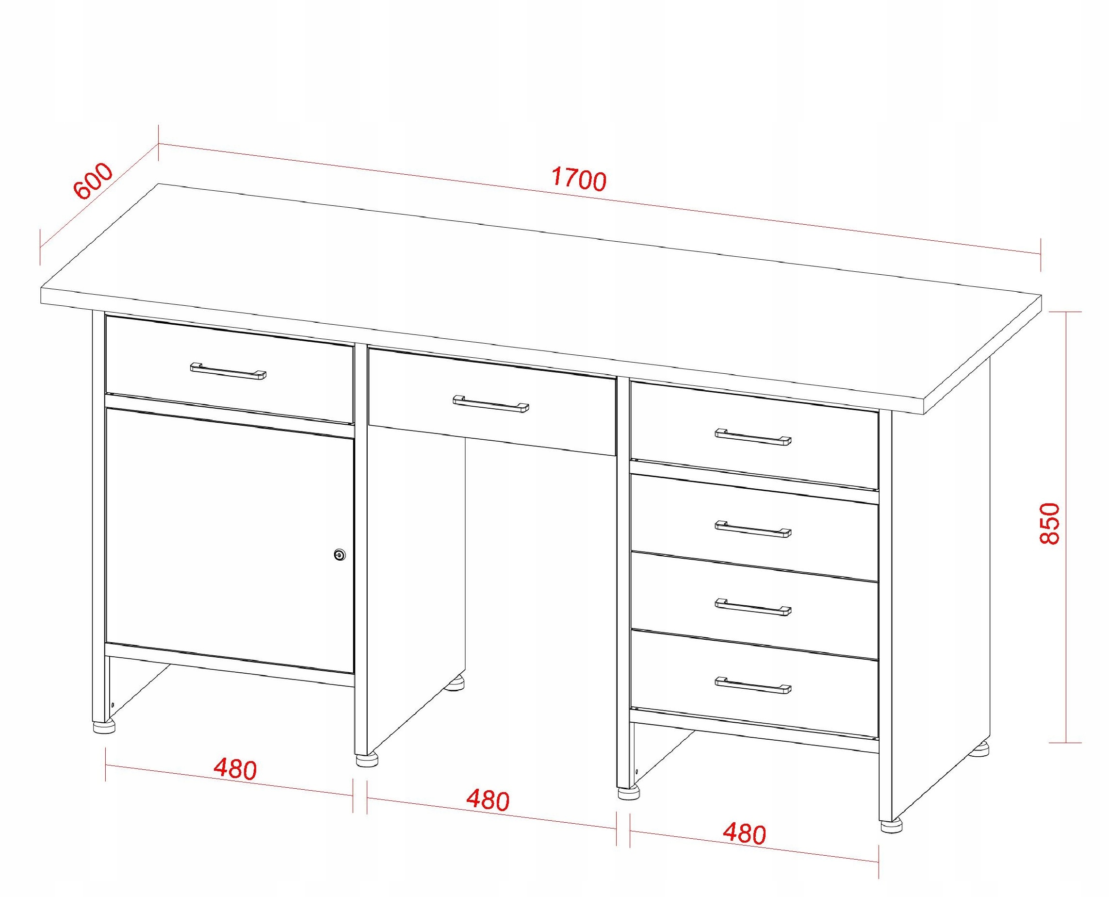 - хранилище - 6 вместительных ящиков (для ручного инструмента, аксессуаров и мелких элементов) и 1 запираемый шкаф (для более крупных устройств, расходных материалов или документации)