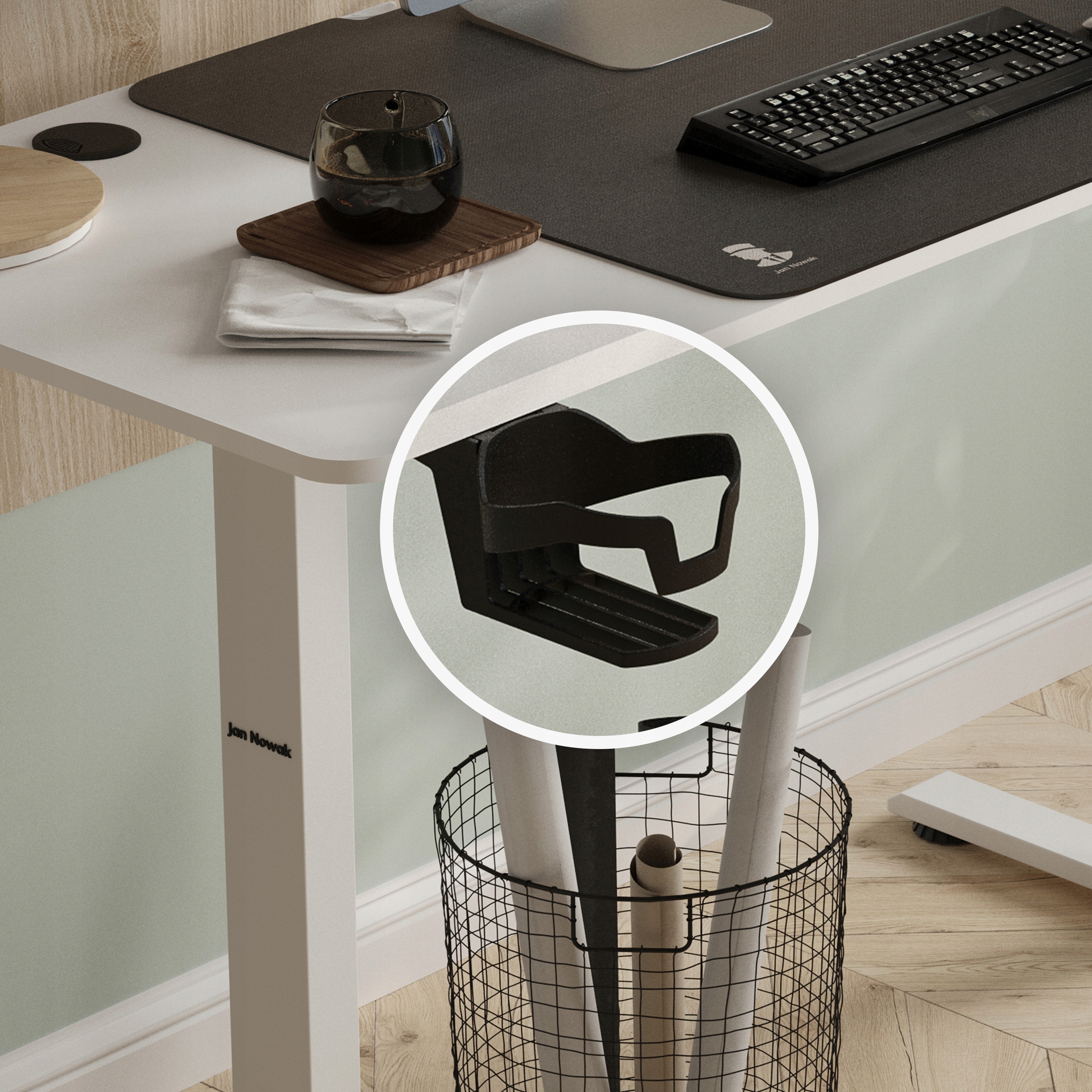 Маленькие столы особенно нуждаются в хорошей организации. В противном случае нехватка свободного места будет означать, что вас постоянно что-то будет беспокоить. Письменный стол EGON имеет две удобные ручки из прочного пластика. Благодаря им предметы, без которых вы не представляете свою работу, останутся рядом с вами, но не займут места на столешнице. После конференции вы сможете повесить наушники на вешалку, а кофе будет в целости и сохранности в подстаканнике и точно не прольется на важные документы, ноутбук или клавиатуру.
