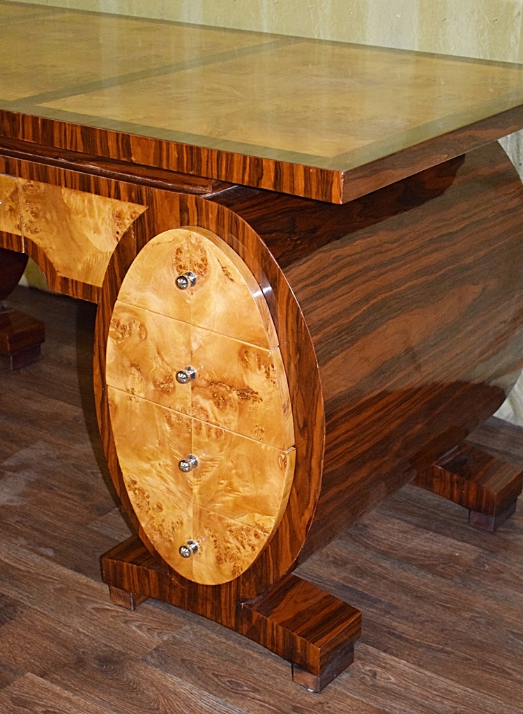 Предмет мебели выполнен в современном, старинном стиле, сохраняя все формы, характерные для ар-деко. Материал - 100% дерево цвета светлого и темного ореха с фантастическими оригинальными узорами натурального капа.Письменный стол имеет один ящик посередине сверху и четыре ящика поменьше по бокам.