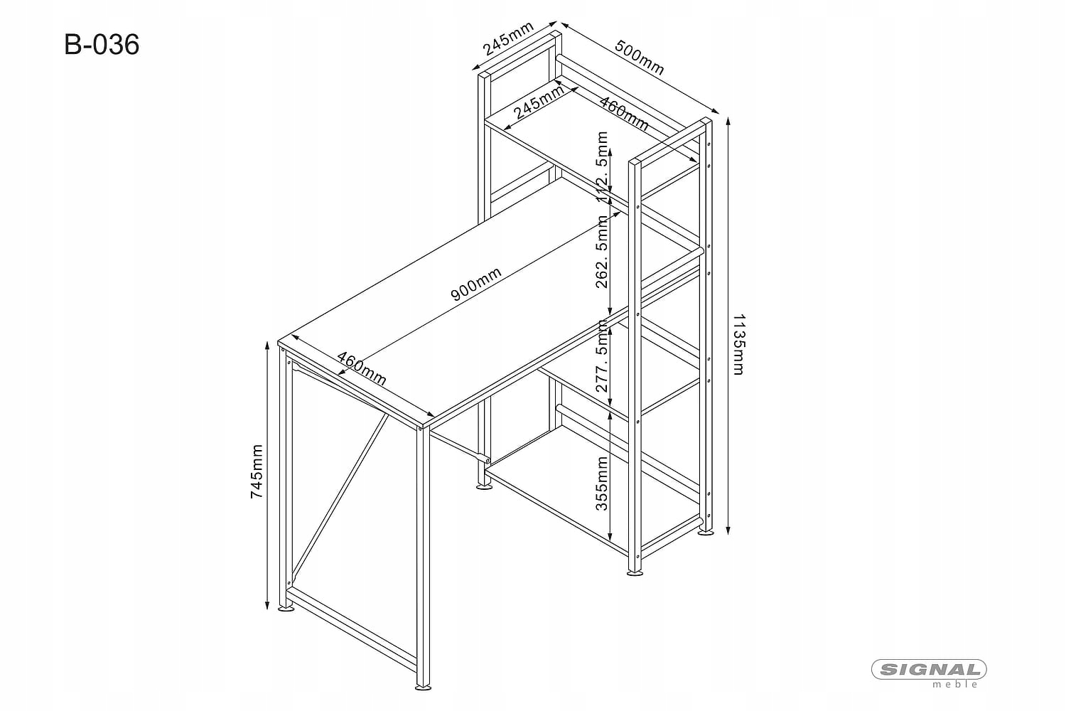 Письменный стол-чердак B-036 — минималистическое решение для офиса или комнаты. Благодаря своей простоте он идеально подойдет для интерьера в стиле лофт или модерн. Строгий внешний вид не перегружает интерьер. Сочетание столешницы цвета дуба с черным металлическим каркасом – вневременное решение, которое не выйдет из моды. Дополнительные полки обеспечивают удобное хранение, например, документов или других канцелярских товаров, а также позволяют разместить на полках любое количество предметов, необходимых для работы или учебы.
