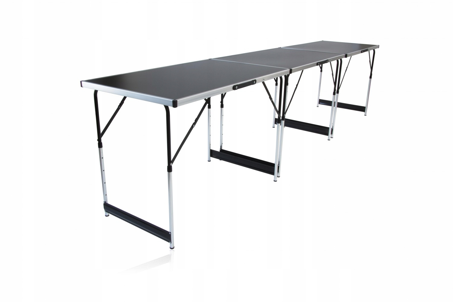 Благодаря простой системе складывания столы можно быстро собирать и разбирать, а также легко транспортировать с помощью ручки для переноски. Три стола можно надежно соединить вместе с помощью прилагаемых кронштейнов, что позволяет индивидуально расширять рабочую поверхность.
